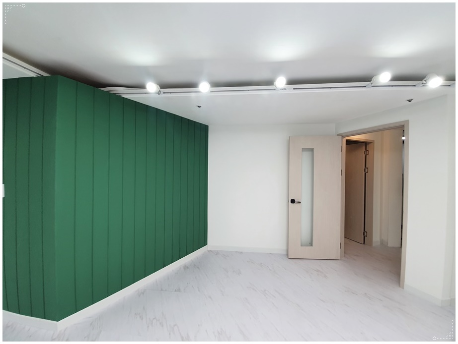 완성된 외부 파사드와 내부 파사드입니다. 그린계열로 포인트를 주고 방화문은 베이지 필름지로 시공했습니다. 입구로 들어가면 보이는 정면에 외부 파사드에 쓰인 그린계열로 도장한 아트월을 세워 익스테리어와 인테리어가 자연스럽게 연결되도록 했죠. 입구의 아트월은 내부 모습을 직접적으로 볼 수 없게 차단해주는 역할도 있지만 기업의 이미지를 표현할 수 있는 요소가 될 수 있습니다.