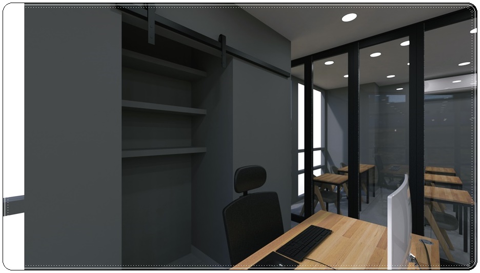 강의실은 심플한 벽면에 그레이 컬러로 마감하고 폴딩도어의 프레임과 어우러져 깔끔하면서 세련된 공간으로 조성했습니다. 카페분위기의 로비공간과는 완전히 대비되는 분위기로 수업이 진행되는 교육공간으로의 차별성을 두었습니다. 조명은 주광색과 전구색을 교차해 공부에 방해되지 않으면서 집중력을 높일 수 있도록 시공했습니다. 벽면의 짜투리 공간을 활용해 창고로 구성했고 행거도어를 설치해 공간을 효율적으로 할용하면서 디자인 요소도 상승시켰습니다.