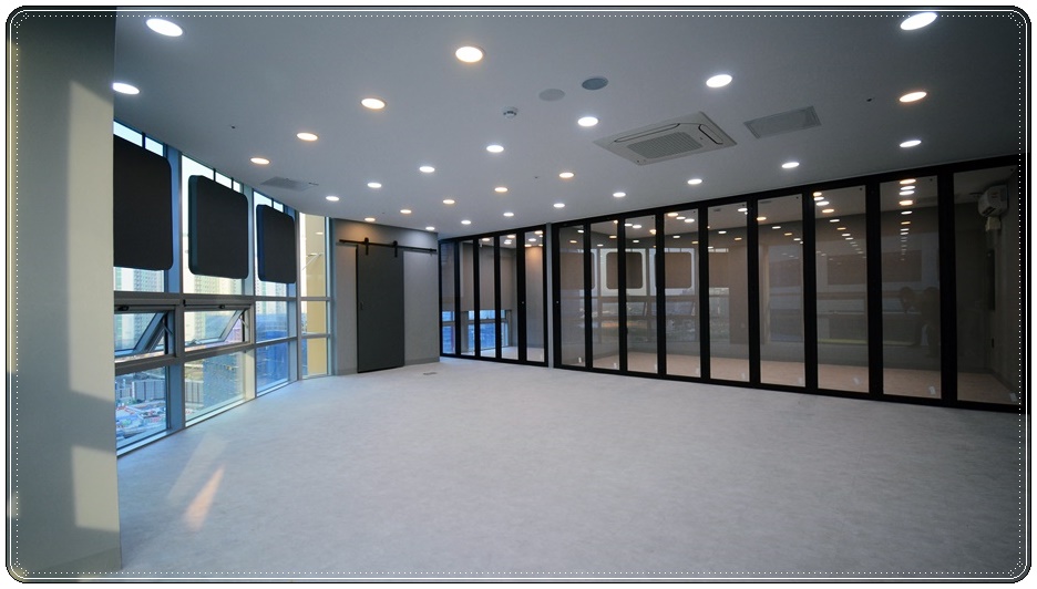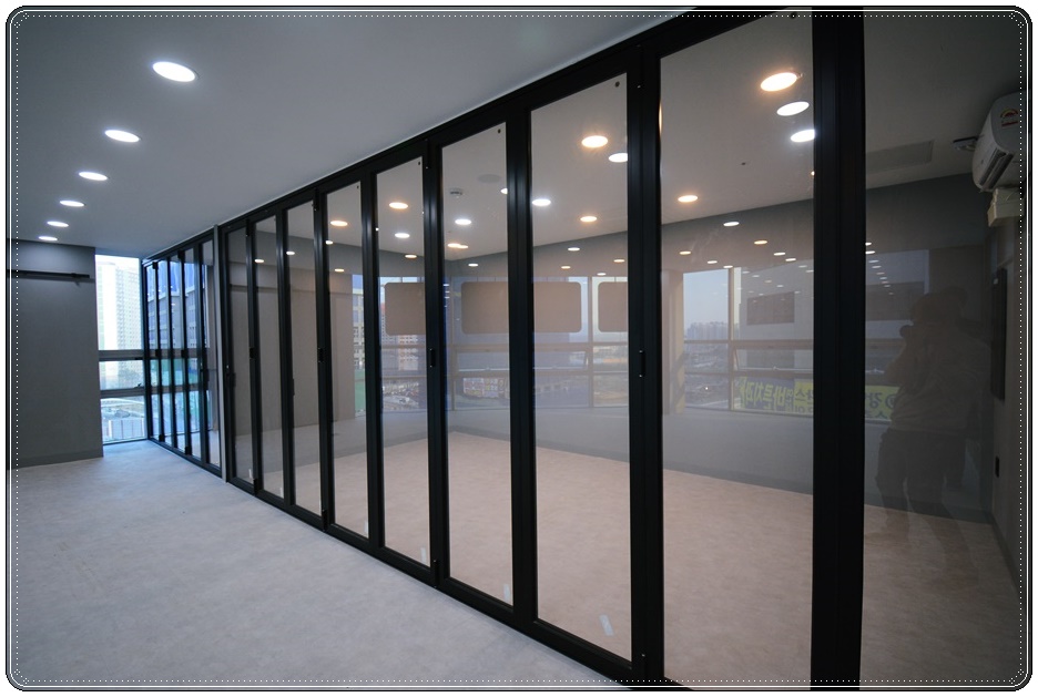 중형 강의실과 소형 강의실의 공간을 분리하는 폴딩도어입니다. 공간에 맞는 문짝수와 스타일을 적용하면 안전하게 사용할 수 있으면서 공간을 효율적으로 활용할 수 있는 폴딩도어와 내부 강의실의 진회색 마감이 너무도 잘 어울리네요. 법률상으로는 교실 내부에 교실이 있으면 안되지만 폴딩도어를 사용하면 전체를 하나로도 분할해서도 활용할 수 있기 때문에 학원 인테리어에 활용하면 공간 구성 및 활용을 극대화할 수 있습니다.