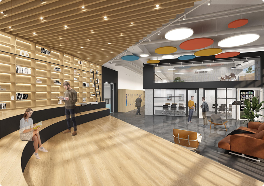 일과 휴식의 균형을 중요하게 생각하는 최신 트렌드를 반영해 북카페 분위기로 조성을 했고 창문의 자연채광을 충분히 받아들이면서 내부도 내추럴한 분위기를 만들 수 있도록 우드를 메인으로 적용해 계획했답니다. 바닥은 진한 그레이를 적용하고 블랙을 포인트 컬러로 사용해 모던한 느낌을 더했으며 천장에는 컬러풀한 디자인을 더해 활력을 더해 자유롭게 경쾌한 분위기를 연출하고 있습니다.