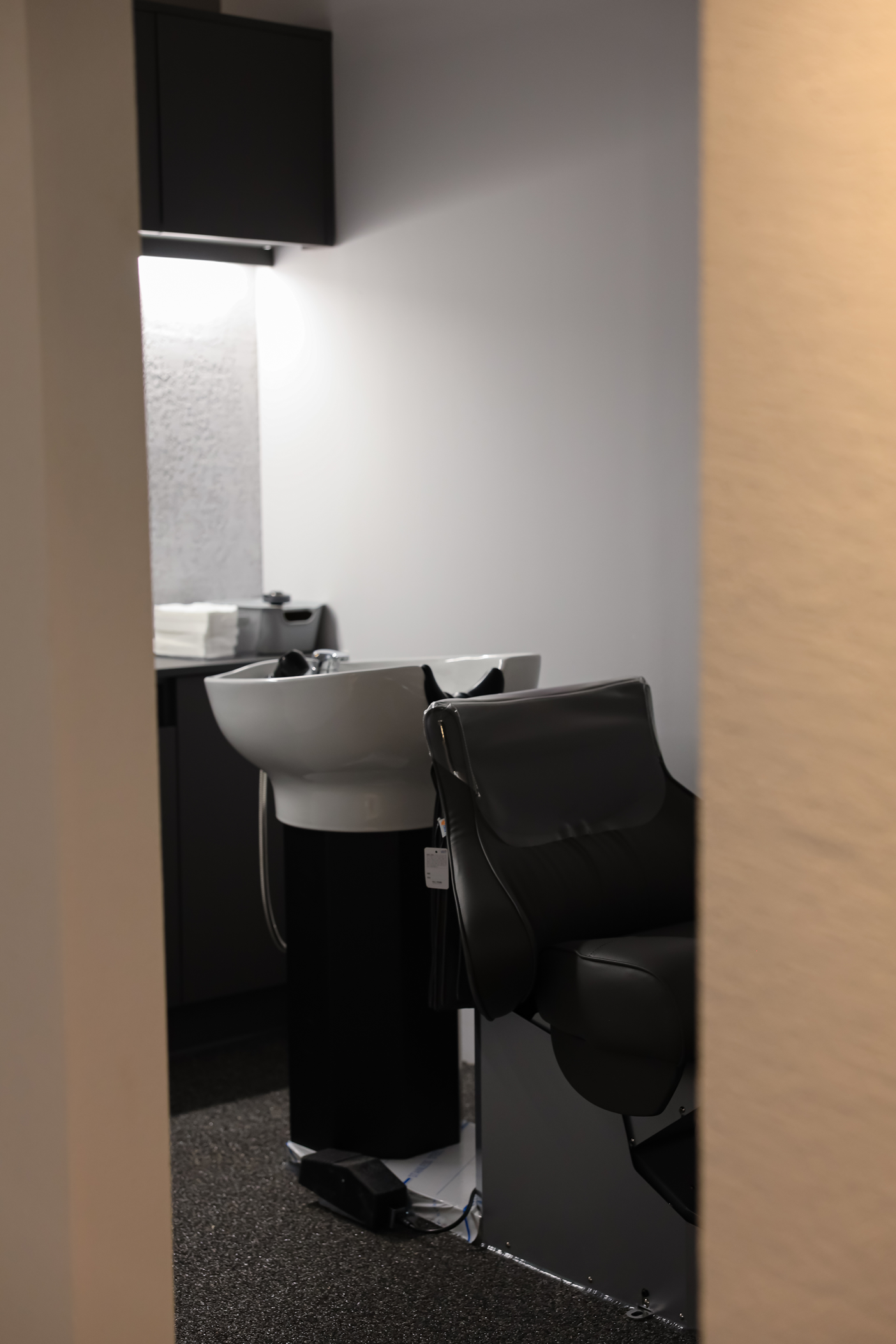 시술 공간 뿐만 아니라 제품 진열 공간과 샴푸존까지 조명 배치에 신경써서 헤어샵 인테리어의 품격을 한층 높여주었습니다.