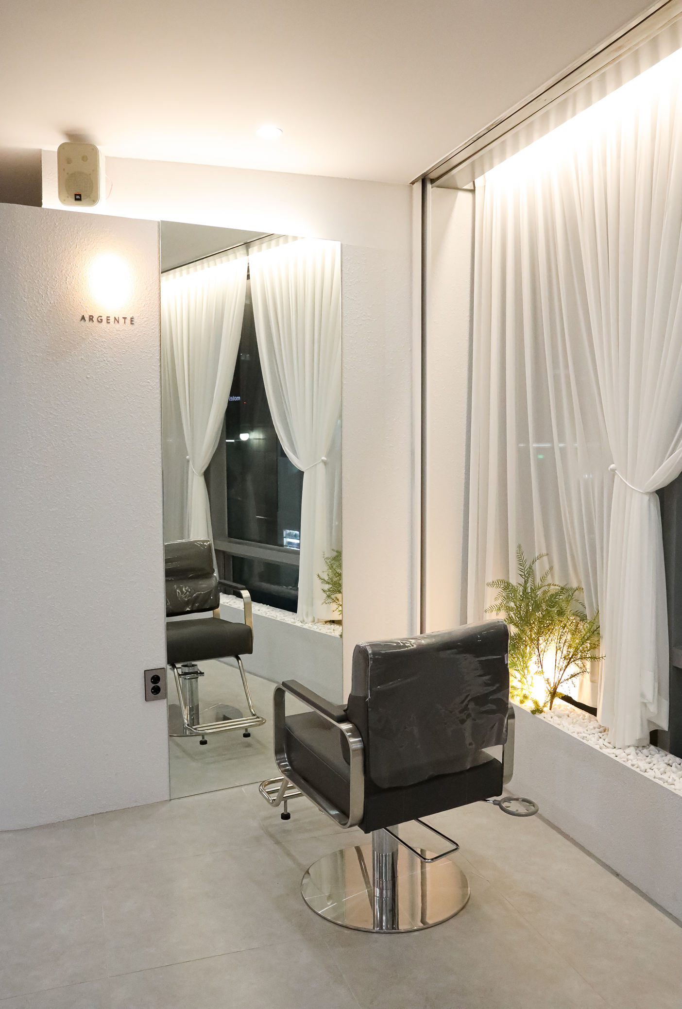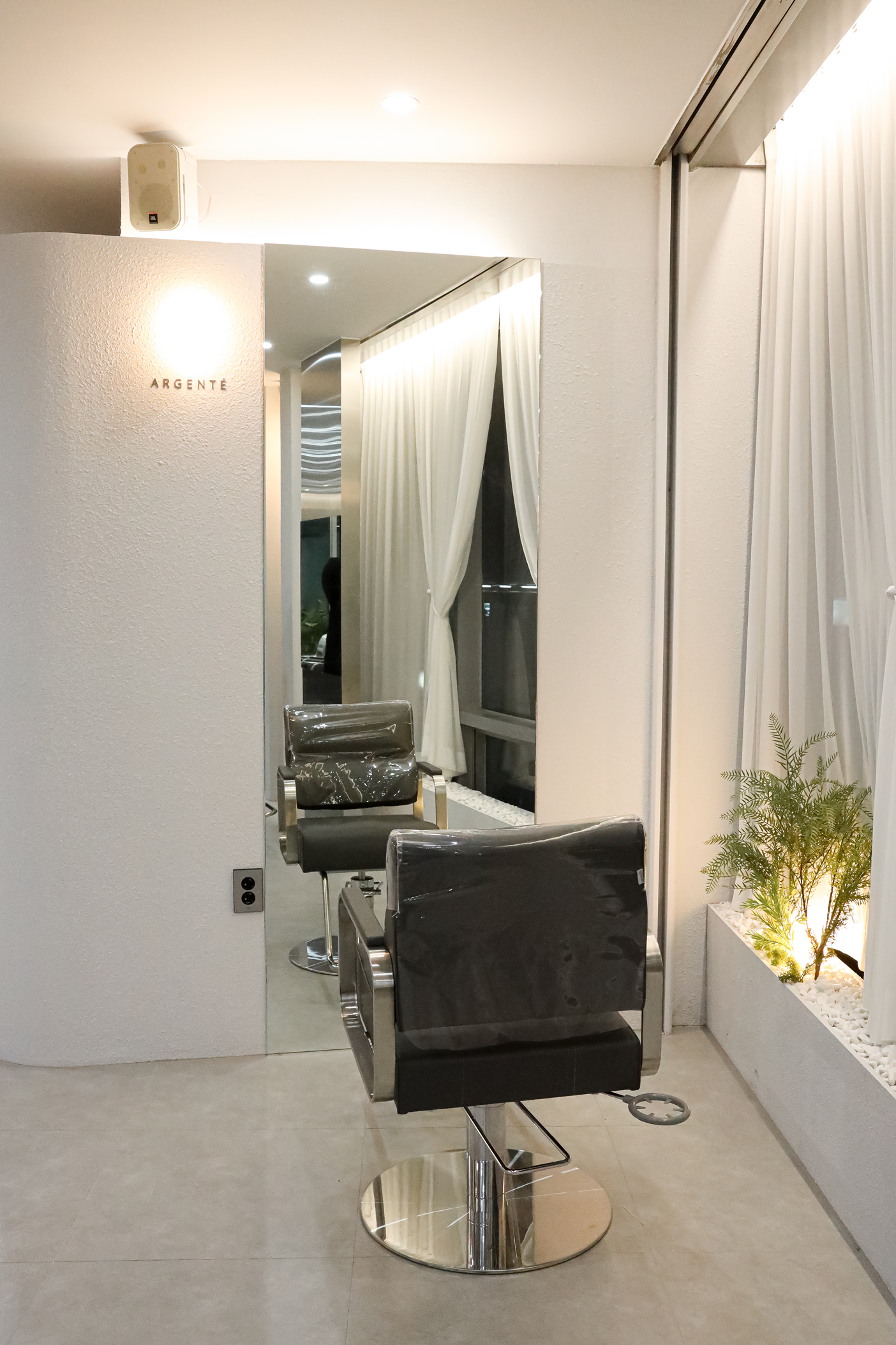 특히 이 쉬폰 커튼 하단과 벽면 하단에는 화이트 자갈로 꾸민 작은 화단 형태의 공간과 플랜테리어가 조합되어 자연스럽고 생동감 있는 분위기를 연출하였습니다. 화이트 톤 공간과 식물의 초록색 대비가 심플하면서도 세련된 포인트가 되어 시술 공간 전체를 밝고 상쾌한 느낌으로 완성한 것이 이번 원주미용실인테리어의 포인트입니다.