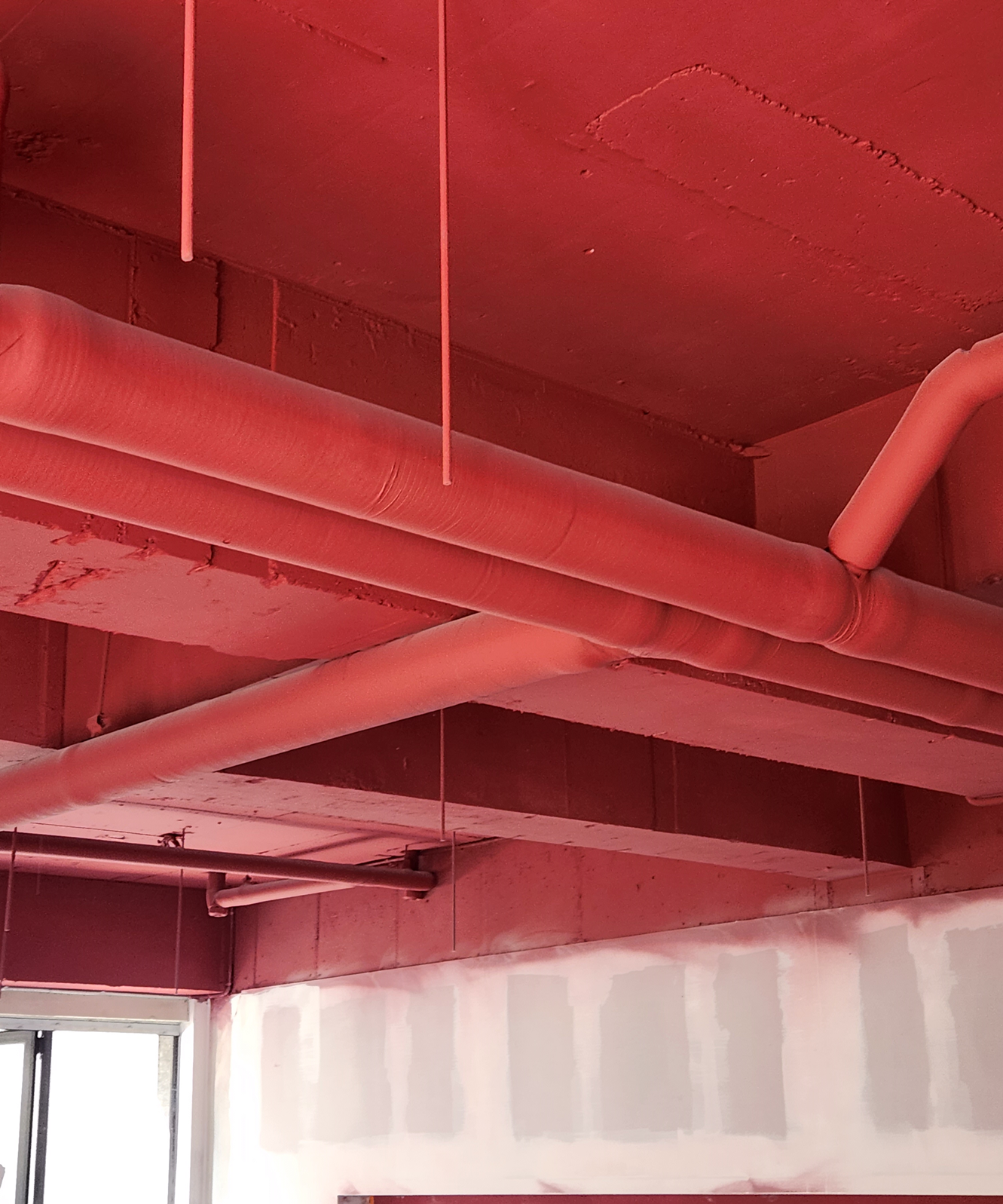 다음으론 도장 작업이 이루어졌습니다. 벽체와 천장, 일부 가구 등은 전체 화이트 도장으로 이루어졌으며, 레드 포인트 벽은 다로 도장 분리 진행하였으며, 통일감 있는 시각효과를 주었습니다.