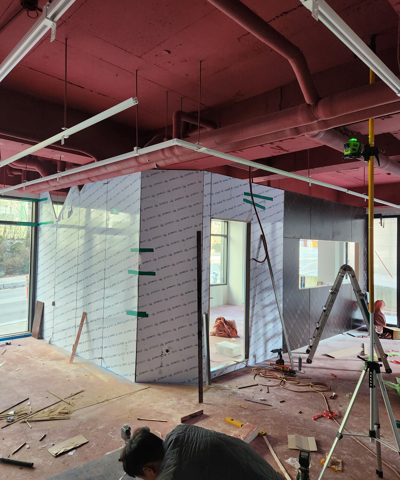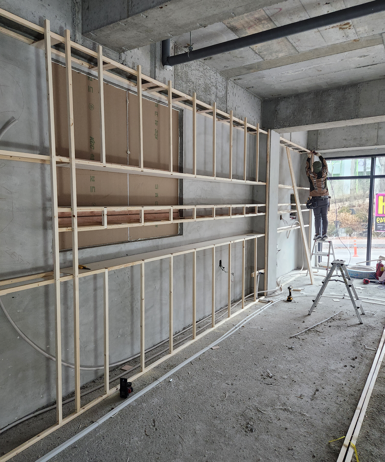 특리 레드 포인트 벽은 목공 단계부터 구조적으로 설계되어 후속 도장, 조명 시공까지 완벽히 일체감 있게 이어질 수 있도록 계획되었습니다.