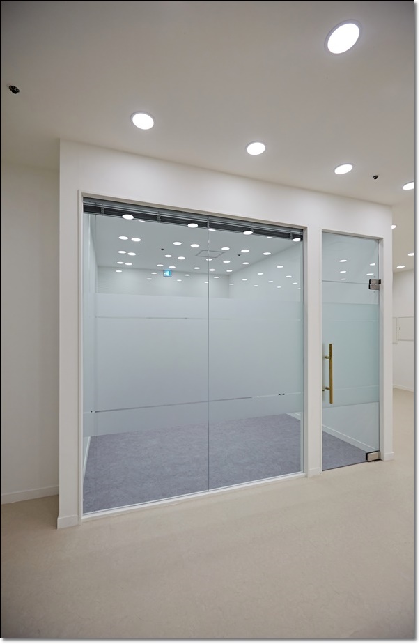 회의실 또한 개별 공간으로 분리했는데요, 가운데에 폴딩도어를 달아 공간을 통합하거나 분리해서 사용할 수 있도록 했습니다. 폴딩도어는 옆으로 접고 펴는 방식을 통해 문을 열고 닫을 수 있는도어로 모두 열면 90% 이상의 개폐율을 확보할 수 있어 다양한 시설에 시공되고 있답니다. 이 곳에서는 폴딩도어를 열면 대형 회의실로 사용할 수 있고 도어를 닫으면 중형 및 소형 회의실로 사용할 수 있어 그에 따른 에너지 절약도 할 수 있답니다.