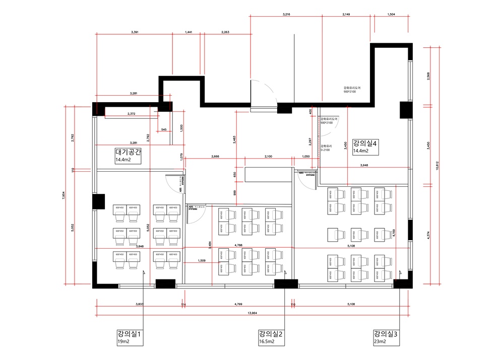 강의실과 자습실의 크기와 배치를 적절하게 조절하여 학생들의 이동 동선을 줄이고, 학습 효율을 높일 수 있습니다.