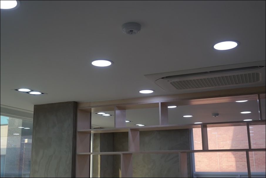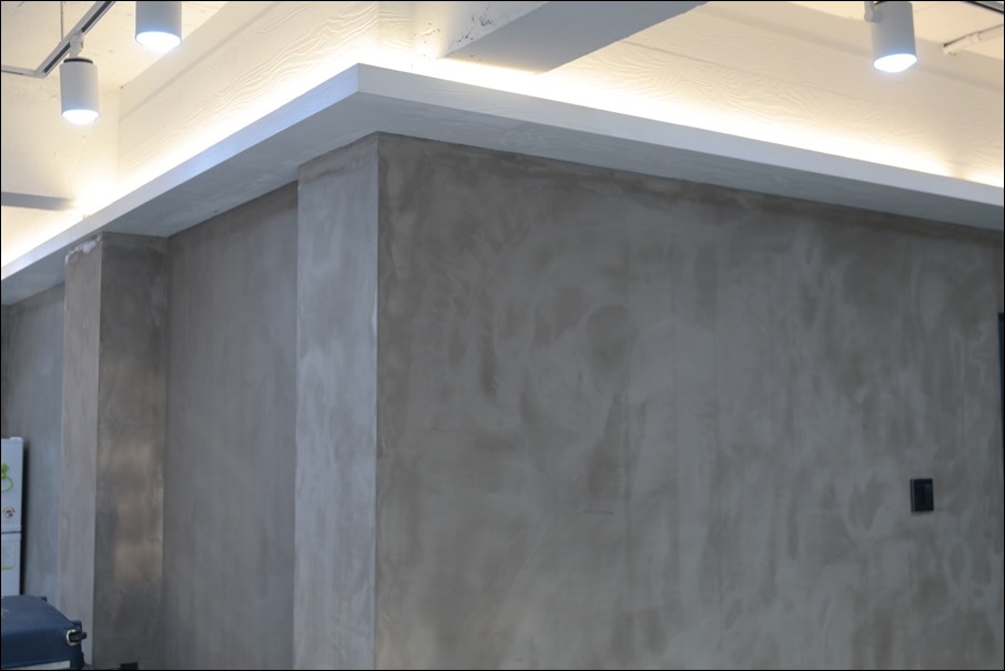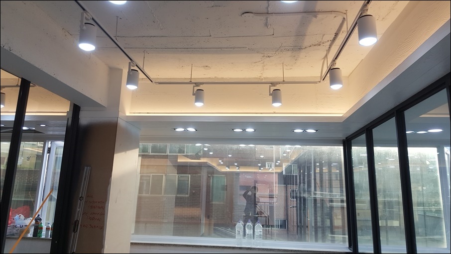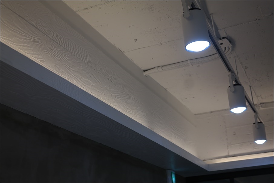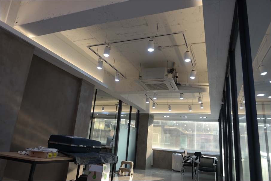 노출 천장을 활용해 층고를 확보했고 천장 테두리를 따라 우물 천장형으로 시공했고 간접등을 설치해 은은한 빛을 내도록 했습니다. 조명을 전체적으로 매립형 조명을 시공했고 노출천장인 대표실과 라운지홀은 천장 레일 조명을 시공해 빈티지하면서 자유로운 분위기를 조성했습니다. 레일 조명은 위치와 각도를 조절할 수 있어 유연하게 사용할 수 있다는 장점이 있고 노출 천장에 시공하면 특별한 장치 없이도 트렌디하고 독특한 인테리어가 될 수 있습니다.