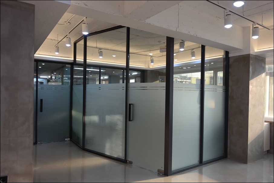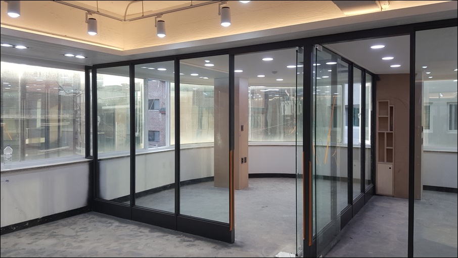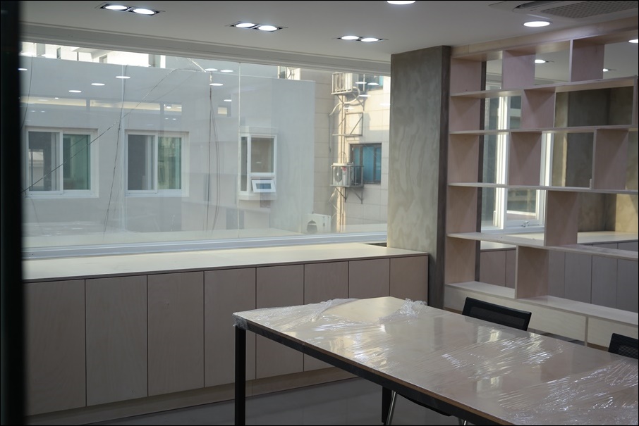 들어오는 입구부터 천천히 둘러볼까요?입구로 진입하면 가장 먼저 대표실이 있는데요, 일반적으로 가장 안쪽에 배치되는 대표실이 입구쪽에 있는 것은 외부 업무가 주를 이루시는 대표님의 요청에 의해 안쪽에는 직원들이 근무하는 공용 사무실과 자료실을 배치했고 홀은 회의실겸 방문객 대기실로 활용하도록 했습니다. 대신 대표님이 너무 동떨어진듯 느끼시지 않도록 유리 가벽을 적용해 개방감을 주었고 시트지를 시공해 프라이버시를 확보했습니다.