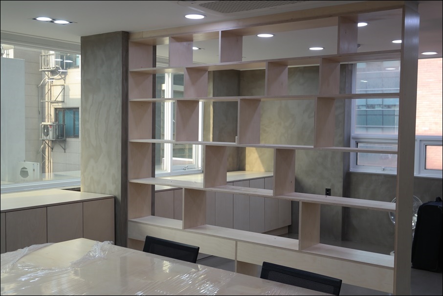 진열이나 책장 등으로 멀티 사용이 가능하도록 앞뒤가 뻥 뚫린 오픈형 장이 시공된 모습입니다. 유리 가벽으로 개방성을 확보한 사무실에 꽉 막힌 수납장을 배치했다면 너무나 비효율적이면서 답답해 보였을텐데요, 오픈형 장이 휴게 공간과 업무 공간의 파티션 역할을 충실히 하고 있습니다. 맞춤 가구는 인테리어와 잘 맞아떨어지고 튼튼하다는 장점이 있지만 견적이 높아지는 요소가 되기 때문에 부담스러울 수 있습니다.