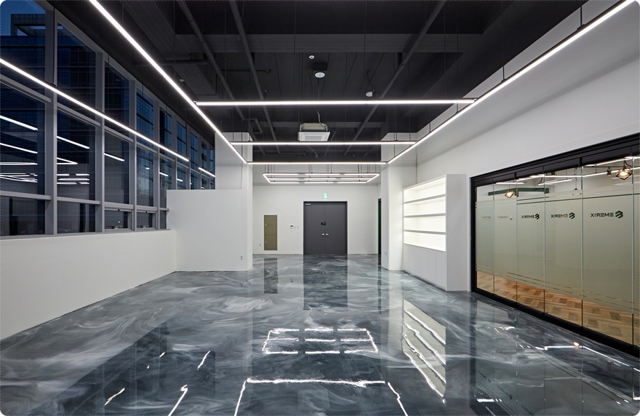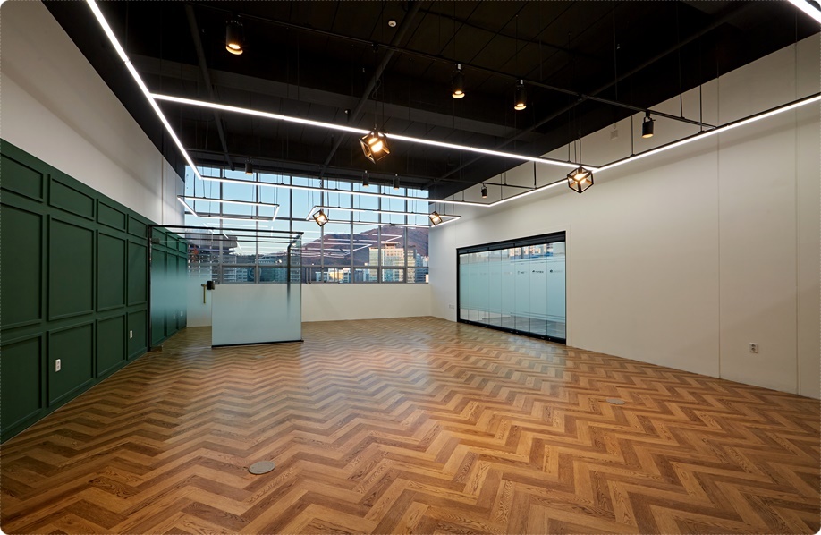 사무 공간입니다. 전체적으로 노출천장으로 시공해 층고를 확보했고 벽면은 화이트로 천장은 블랙으로 시공해 넓고 깊어보이도록 했으며 헤링본 패턴의 우드 바닥과 웨인스코팅의 목공 벽면으로 시공해 고급스러움을 높였습니다. 높은 층고를 고려해 라인조명을 스퀘어로 디자인해 팬던트형으로 시공했고 레일조명, 보조조명 등을 시공해 조도를 확보했으며 전면창을 활용해 자연채광을 충분히 활용할 수 있도록 했습니다.