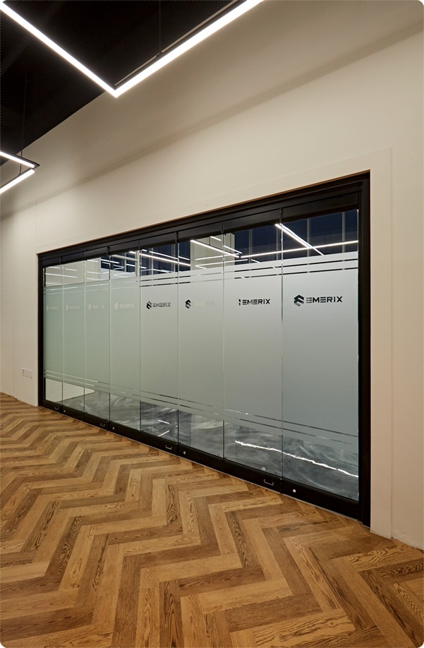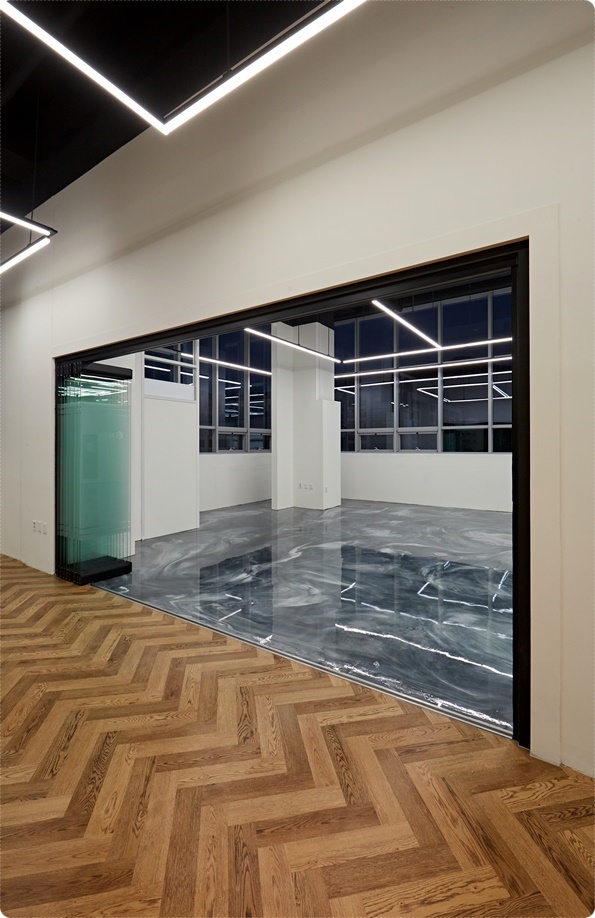 쇼룸으로 연결되는 도어를 사무실에서도 진출입할 수 있도록 벽면에 타공 도어를 시공해 편의성을 높였습니다. 도어는 글래스 폴딩도어로 시공해 통일성을 주었고 문을 열고 닫음에 따라 공간을 통합하거나 분리해 사용할 수 있도록 했습니다.