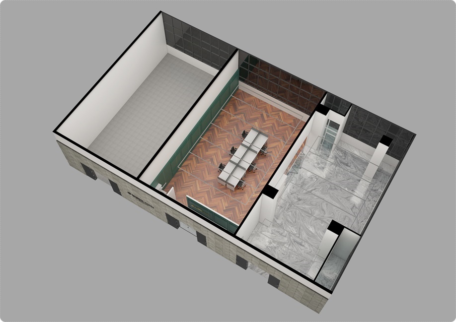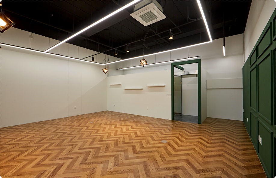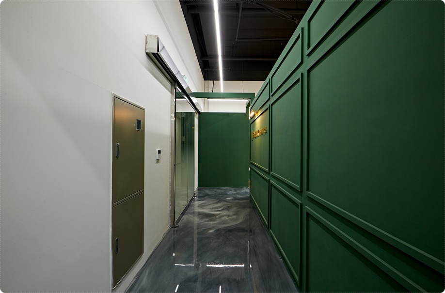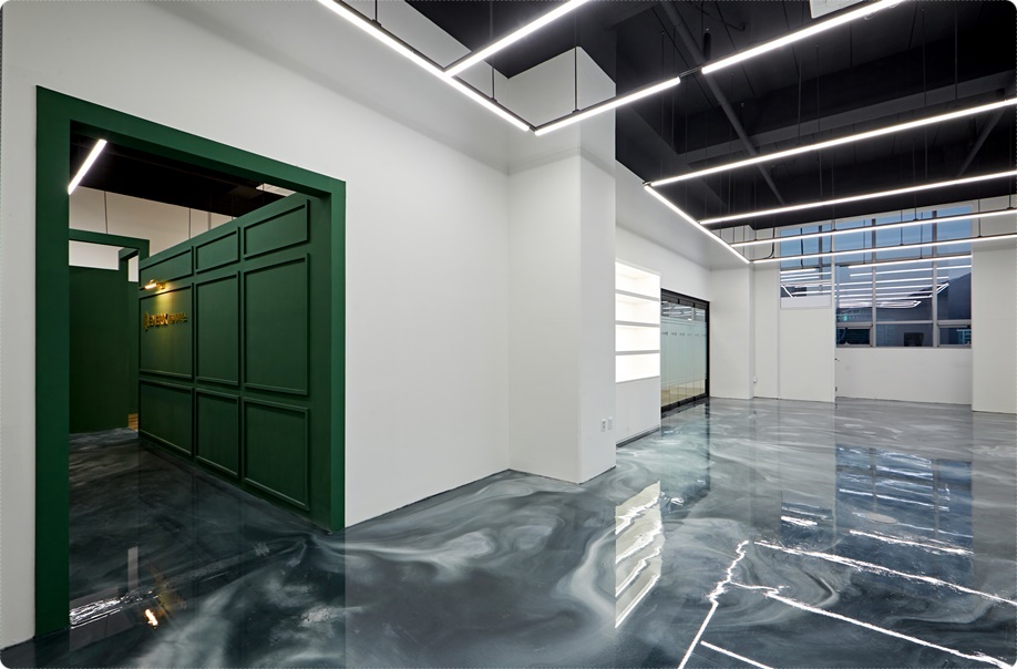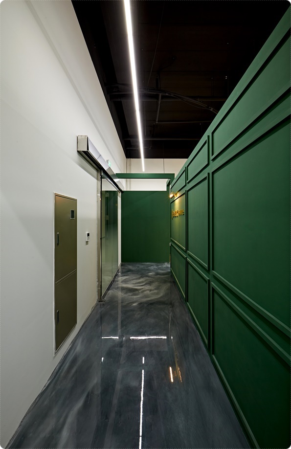 외부 파사드의 시크하면서 중후한 분위기를 딥그린 컬러로 받아 자연스럽게 인테리어로 이어지도록 하는 아트월에 골드 컬러의 업체명 사인물과 벽부등을 시공해 포인트를 줬고 바닥은 마블모양의 노출 빈티지로 마감했습니다. 아트월을 중심으로 사무실과 쇼룸으로 이동할 수 있는 동선을 분리해 직원과 방문객 동선을 명확히 나눴고 가독성을 높였습니다.