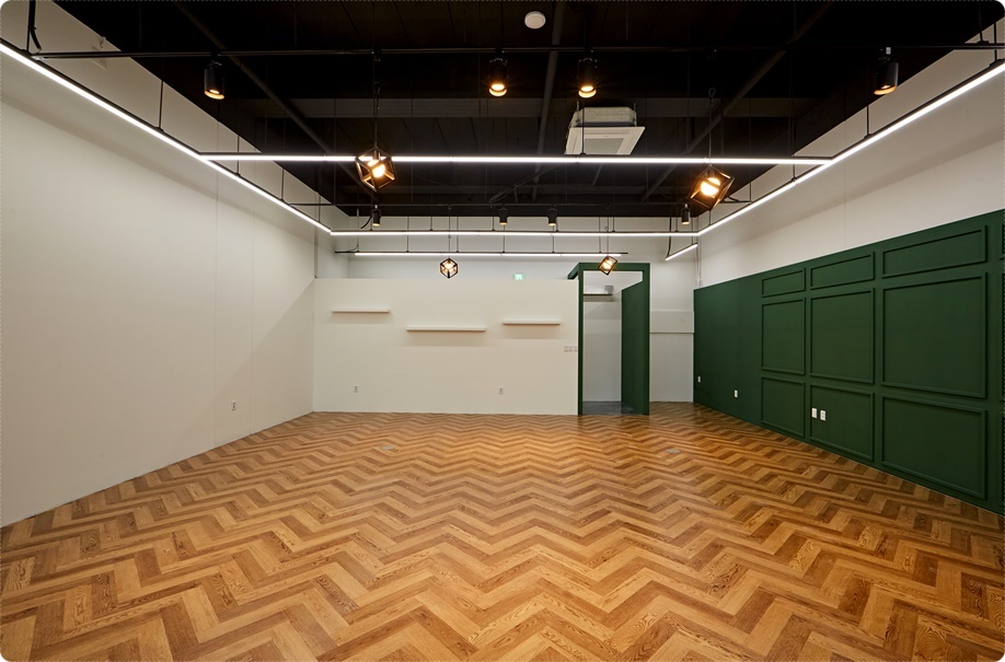 웨인스코팅을 시공한 딥그린 내부 파사드 아트월입니다. 입구측에 아트월을 시공하면 외부로의 노출을 막을 수 있고 동선을 유도할 수 있어 프라이버시 확보는 물론 보안성을 확보할 수 있답니다.