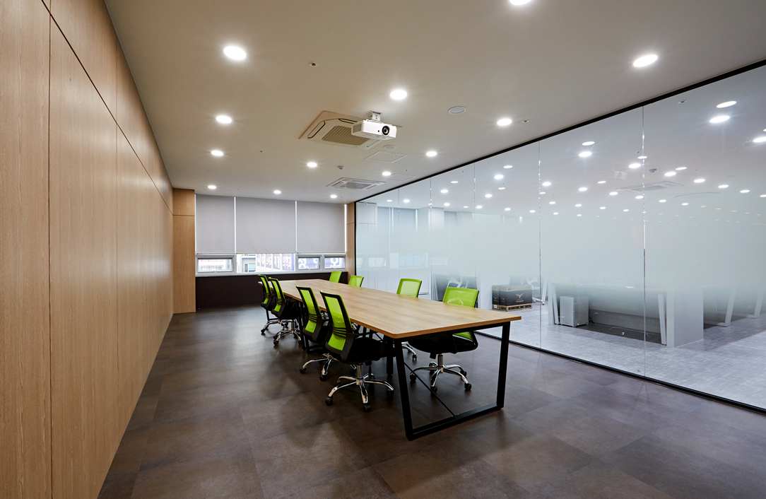 회의실은 중요한 업무 협의와 미팅이 이루어지는 공간인 만큼, 고급스럽고 집중할 수 있는 분위기를 조성하는데 초첨을 맞추었습니다. 외부와의 경계는 블랙 프레임 유리가벽을 시공하여, 사무공간과 시각적인 통일성을 이루면서도 프라이버시를 확보하였습니다.
