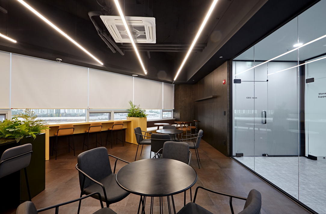 사무공간으로 들어서면 유리 가벽의 카페테리아가 있습니다. 공간을 감싸는 유리가격은 시각적으로 부드럽고 유연한 곡선을 이루며, 사무실 전체 분위기에 세련된 포인트를 주었습니다.