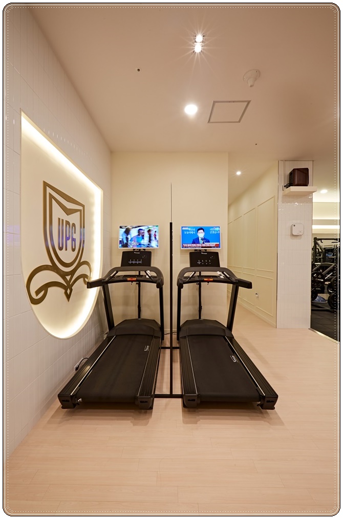 헬스장은 화이트와 우드톤으로 마감하고 머신은 블랙으로 배치해 고급스러우면서 모던한 분위기로 인테리어했습니다. 화이트 천장에 매립형 조명을 시공해 층고를 확보하면서 깔끔한 느낌이 들도록 했고 바닥은 우드톤으로 마감해 안정적인 느낌이 들도록 했습니다. 프리웨이트존에는 벽면 거울과 간접조명을 더해 정확한 동작으로 올바른 운동을 할 수 있도록 했고 바닥에 고무 매트를 깔아 부상을 방지하고 층간소음을 줄였습니다.