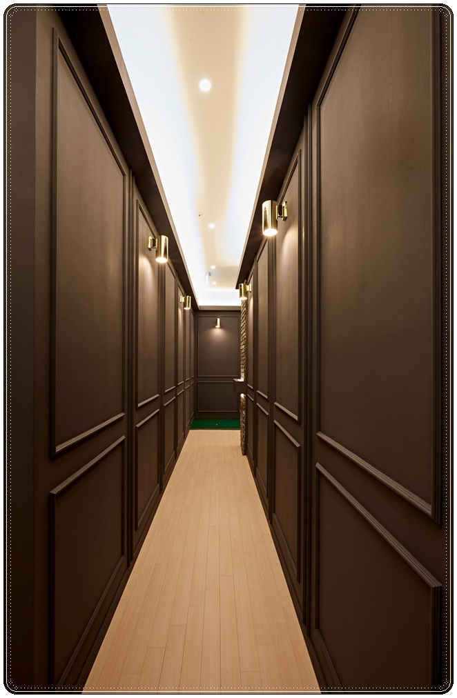 스크린 골프를 할 수 있는 골프 영역은 아치형 출입구를 따로 두어 트레이닝 영역과 완벽하게 구분했습니다. 골프영역은 고급스러운 진한 컬러로 마감을 했고 각 스크린룸은 가벽을 세워 개별 공간으로 조성했으며 가벽을 세워 생긴 복도라인으로 이동하도록 동선을 유도했습니다. 타일로 마감한 헬스장 기둥과 달리 골프 영역의 기둥은 파벽돌로 마감해 고풍스러운 분위기를 줬으며 골드 메탈 벽부등을 시공해 고급스러움을 극대화했습니다.