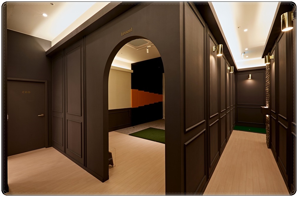 스크린룸 내부입니다. 1:1 맞춤 레슨이 이뤄지는 공간으로 크림색과 브라운을 매치해 답답하지 않으면서 고급스러운 분위기로 조성했습니다. 스크린이 설치되는 공간은 원근감을 느낄 수 있는 디자인을 적용했고 공이 튀어나오는 것을 대비한 안전장치를 시공해 안전하게 이용할 수 있도록 했습니다.