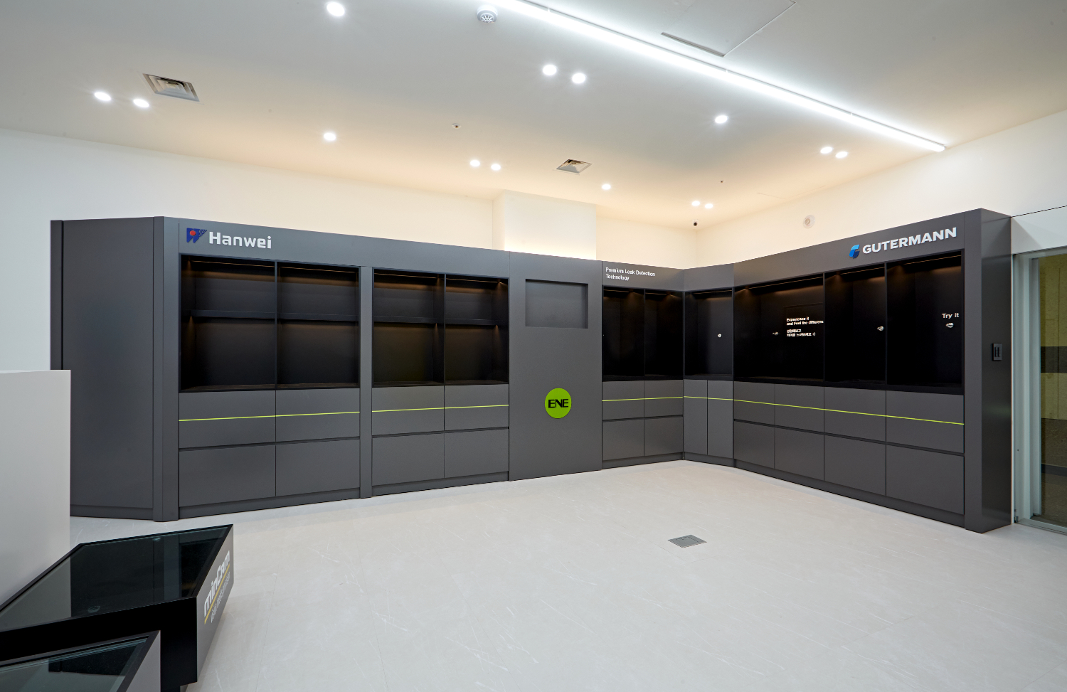 그레이색상으로 만들어낸 왼족의 파사드에서도 그린 컬러가 중앙을 관통하는 듯한 모습으로 매력 포인트를 연출하였습니다. 인천사무실인테리어는 보통 따분하거나 심플한 경우가 많은데요. 이번 현장은 정적인 모습을 유지하면서도 이런 색감 연출로 생동적인 느낌을 만들기 위해 노력했습니다.