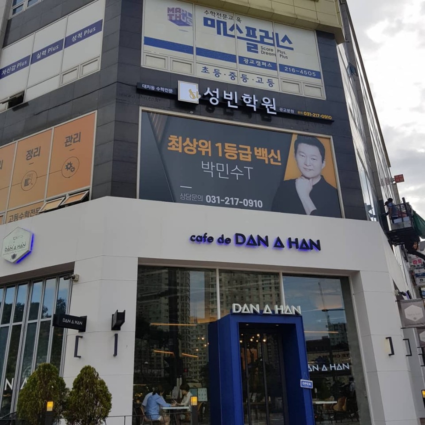 건물 외부 간판과 시트지 시공까지 완성된 모습입니다. 현수막으로 가려졌던 창문에 대표 강사의 얼굴을 프린팅한 시트지를 붙여 홍보 효과를 높였고 측면 창문에는 수업 프로세스를 안내하도록 했습니다.