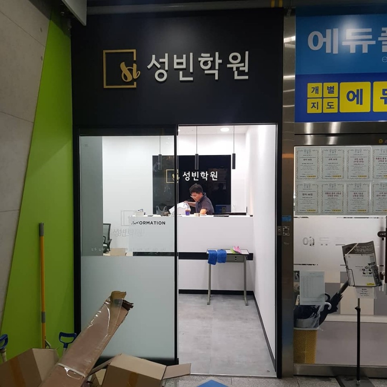 입구과 내부 로비 인테리어가 완공된 모습입니다. 입구는 하단부에 불투명 시트지를 시공한 유리 자동문을 시공해 편의성을 높이고 내부 파사드를 정면으로 보이게 함으로써 외부 간판과 레이어드되면서 가독성이 높아졌습니다. 내부로 들어가면 출입명부를 작성하고 학생들의 출결을 관리할 수 있는 인포데스크가 있는 로비 공간입니다.