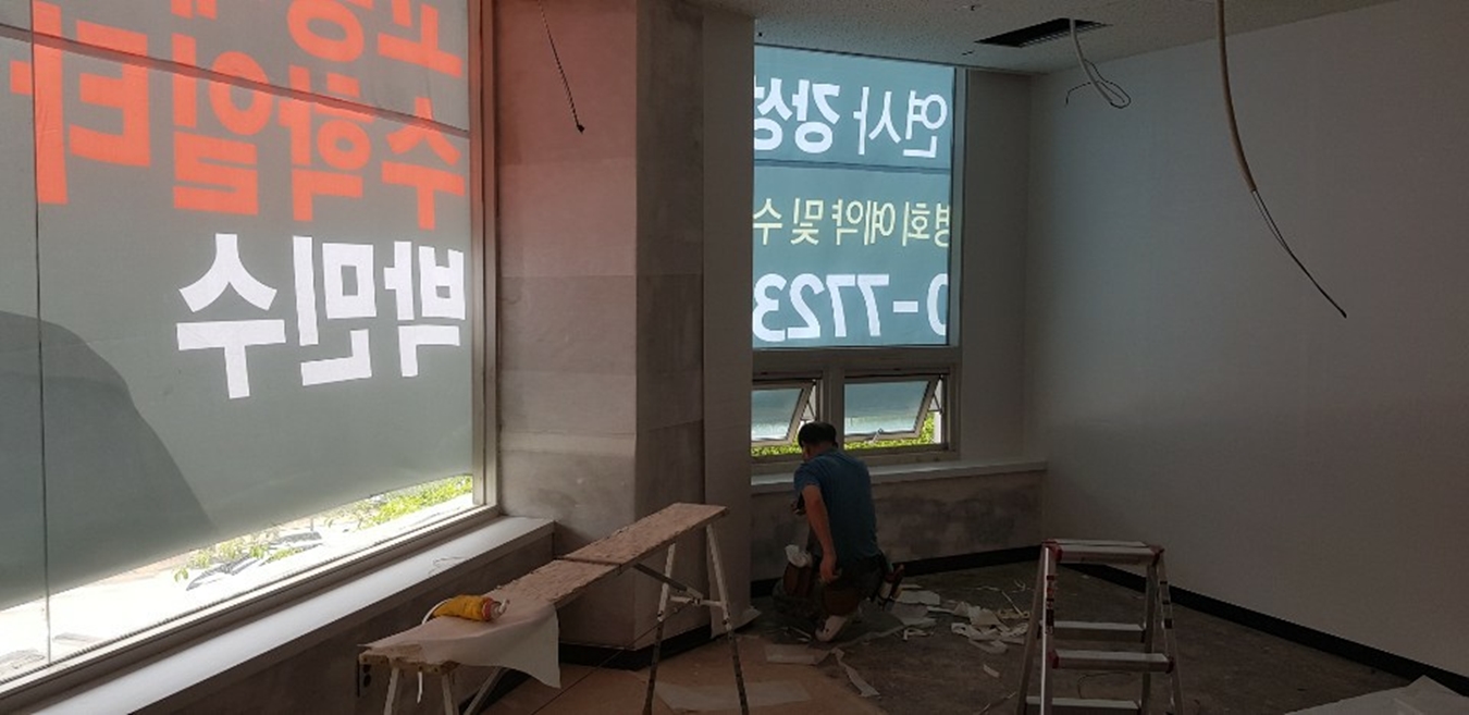 일반 상가건물 2층에 위치한 현장은 공사 기간 동안 외부에 현수막을 걸어 입시설명회를 홍보하고 있었습니다. 상가의 위치에 따라 다르겠지만 이렇게 번화가에 위치해있는 상가에 있는 학원은 대부분 창문에 시트지 시공이 들어갑니다. 그래야 공부하는 학생들도 외부 환경에 영향을 받지 않고 수업에 집중을 할 수 있으니까요.