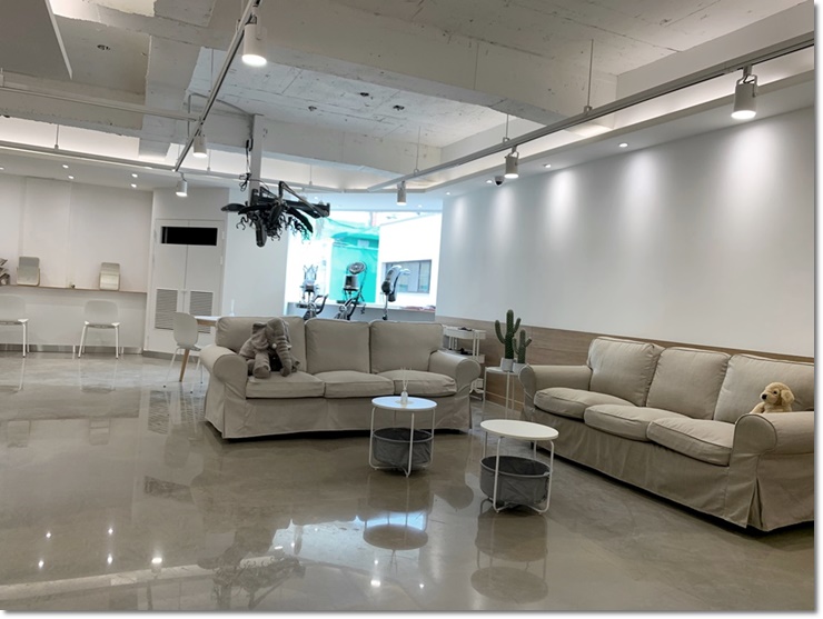 가구 인테리어는 바닥의 색의 연장선으로 베이지톤의 쇼파 2개를 배치함으로 색의 통일성을 추가하였습니다. 뿐만아이라 바깥 전경이 보이는 천장과 쇼파를 등지게 해서 배치함으로 쇼파가 있는 공간은 휴식을 할 수 있는 공간임을 고객들에게 어필을 하고 있습니다. 쇼파 사이에 작은 화이트톤 테이블을 배치하여서 빈 공간이 없게 아기자기 하게 꾸미기도 하였습니다.