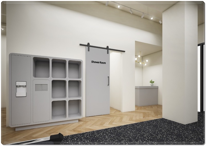이처럼 4개의 공간 중 하나인 샤워실의 모습입니다. 앞에는 운동을 마친 고객들이 이용할 수 있도록 수납장과 출입문이 배치되어있습니다. 자세히 보시면 수납장에 더불어서 정수기가 있는 것을 보실 수 있습니다. 디자인적으로 함께 배치하여서 물이 반드시 필요한 운동 공간에서의 활용도를 높여보았습니다.