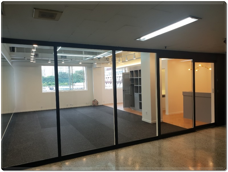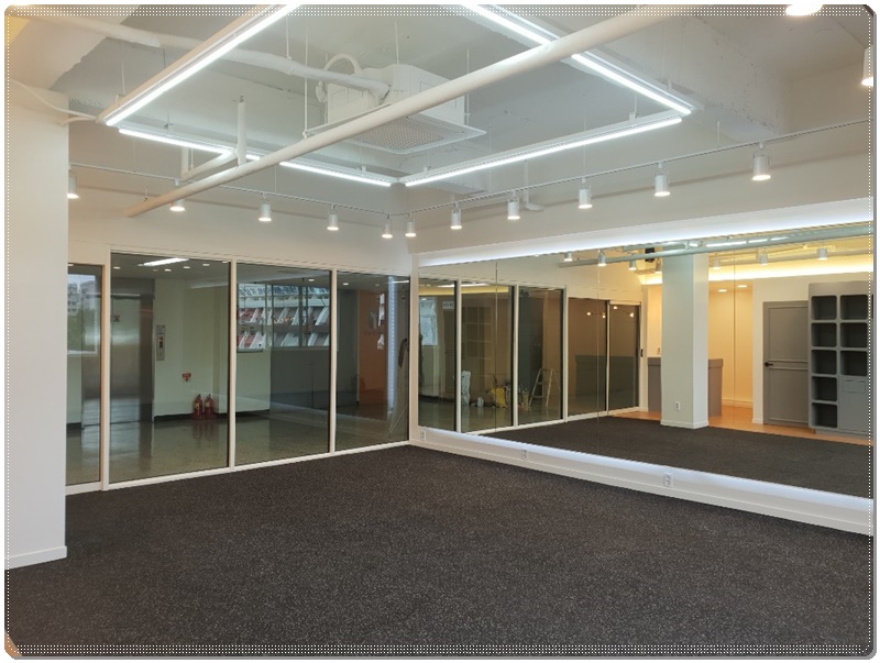 모든 시공이 완성되고 난 후의 사진입니다. 아직까지 헬스장 기구는 들어오지 않았으며 비어있는 공간만을 사진을 찍어서 보여드렸는데 절대 10평 20평이라고는 볼 수 없는 인천 김포 마곡 헬스장인테리어를 넓어보이게 공간 구성을 완성하였습니다. 운동 공간과 기타 공간을 나누는데에는 가벽을 설치하기로 하였습니다.