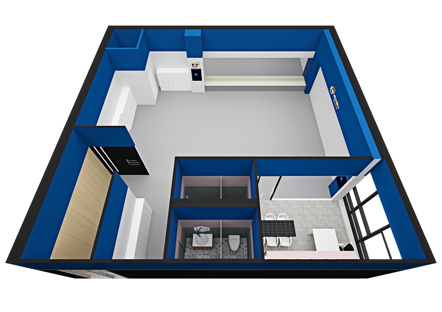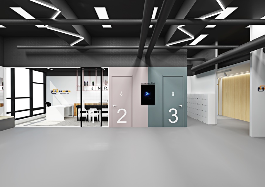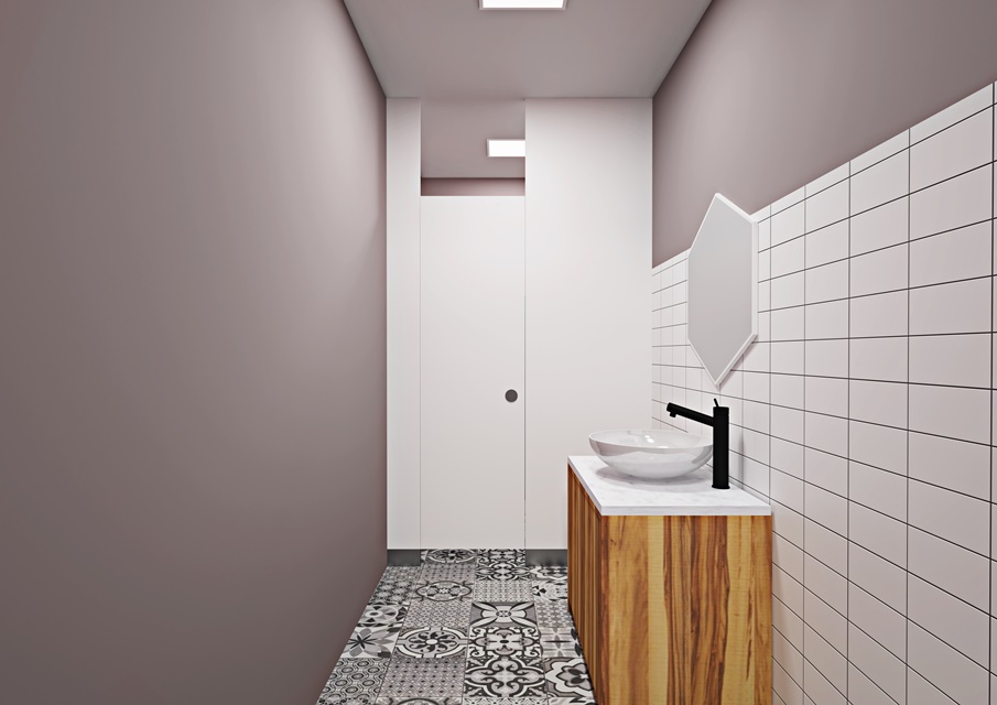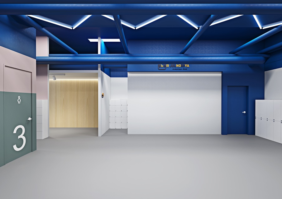 1안과 다르게 화장실 입구를 사무 공간으로 계획해 정면성을 줌으로써 진출입 동선을 단축할 수 있어 사용성과 편리성을 높일 수 있습니다. 사인물 계획에서처럼 화장실 입구에 숫자를 디자인하면 가독성이 높아져 따로 안내를 받지 않아도 쉽게 찾을 수 있고요. 고객님의 요청에 따라 천장 마감 컬러를 블랙으로 한 디자인 설계도 준비를 했는데요, 화장실 벽면 컬러도 여자 화장실과 남자 화장실의 컬러를 달리해 쉽고 명확하게 구분할 수 있도록 했습니다.