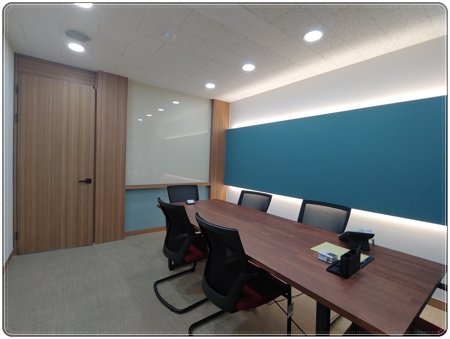이 곳은 회의실입니다. 전체적으로 화이트, 연한 우드톤, 연그레이 등의 컬러를 적용해 밝은 분위기로 연출했고 외부 익스테리어에 사용한 톤다운된 민트컬러를 벽면에 포인트로 활용했으며 간접 조명을 시공해 더욱 화사한 공간이 되도록 했습니다. 대신, 가구는 다크한 우드와 블랙 컬러를 적용해 디자인적 균형을 이루도록 했습니다.