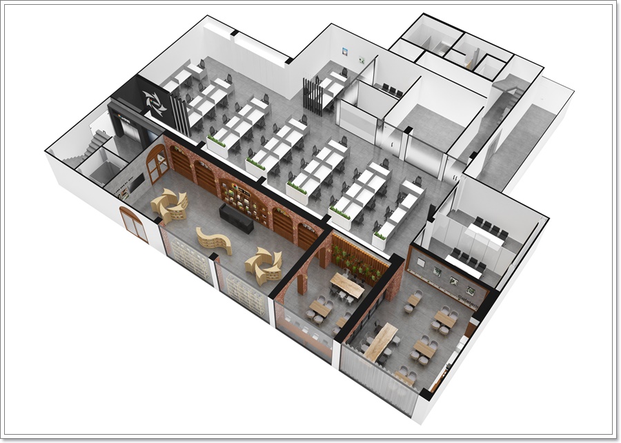 위에서 본 3D 의 모습을 보면서 소개해드리겠습니다. 전체적으로 화이트톤의 외벽과 그레이톤의 바닥으로 디자인 하여서 깔끔한 느낌으로 구성한 사무일 인테리어입니다. 또한 부서마다 포인트 컬러를 통해 부서의 색깔을 녹여보았으며 잘못하면 촌스럽게 보일 수 있는 벽돌 외벽 같은 경우에는 구석구석 포인트 디자인으로 넣어서 현대적인 느낌을 만들어 보았습니다.