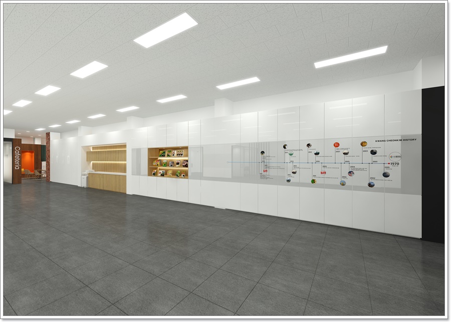 사무실의 외벽같은 경우는 전체적으로 화이트톤으로 배치하였으며 밋밋한 외벽에 공간감을 집어넣었고 참고자료를 부착해서 세련됨을 향상시켰습니다. 외벽에 끝에는 우드톤을 이용한 부분을 만들어서 제품을 진열하였고 사무실에 끝에는 카페테리아와 이어지는 곳으로 벽돌외벽을 이용해 구분을 지였습니다. 이어지는 부분을 기둥을 통해 잘 분리하여서 어색함이 없게 디자인하였습니다.