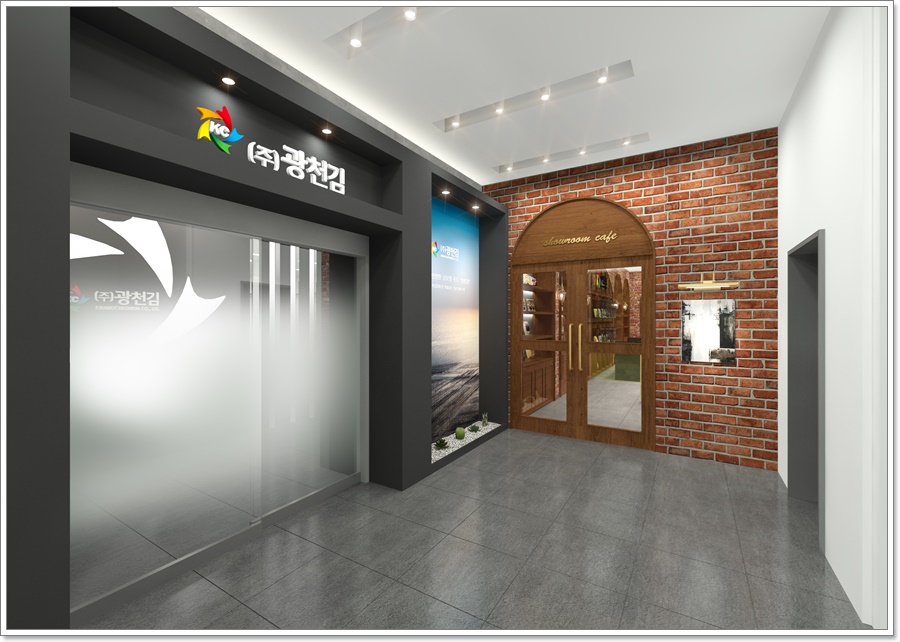 출입문의 모습입니다. 사무실로 들어가는 출입문의 경우에는 전체적으로 검정책 톤을 이용해서 단정함과 무게감을 주었으며 밋밋할 수도 있는 문에 유리문을 넣어서 개방성을 강조하였으며 유리문의 윗 부분에는 다채로운 색의 로고를 넣어서 투박하지만 정이 느껴지는 인터레이를 해보았습니다. 다른 한쪽의 카페테리아는 출입문과는 다르게 벽돌벽을 이용해서 독특함을 연출하였으며 우드톤을 이용한 문과 금박의 로고를 이용하여 유럽풍한 분위기를 만들어보았습니다.