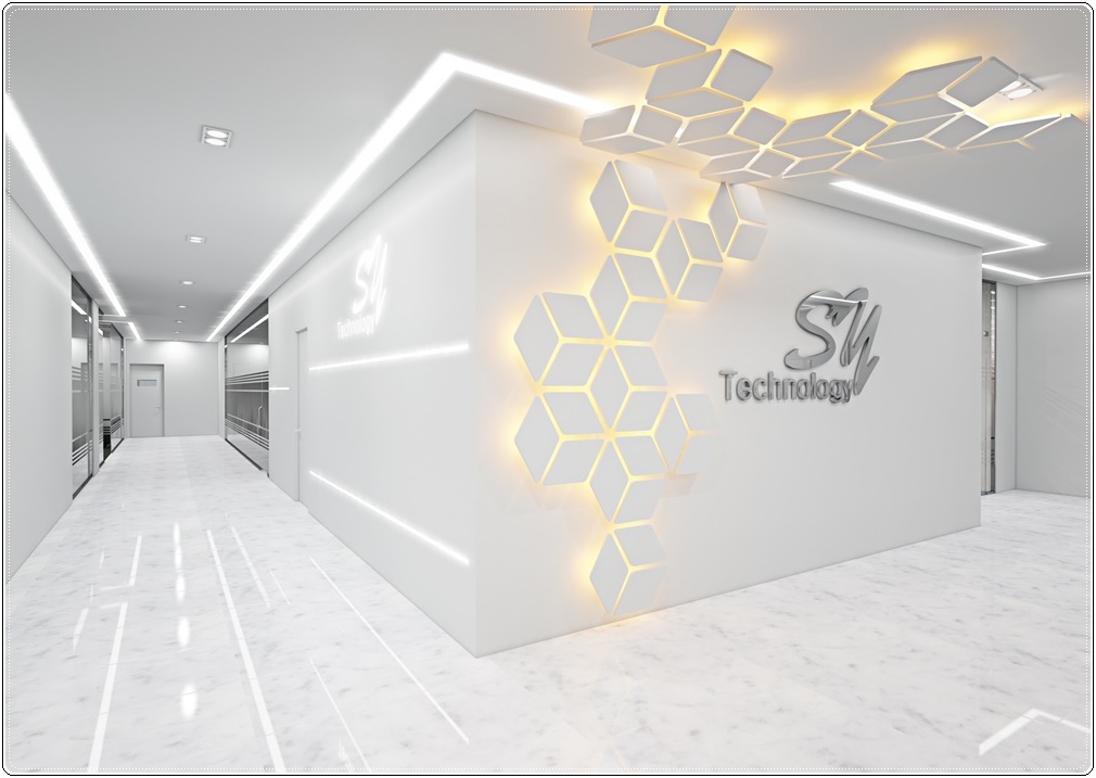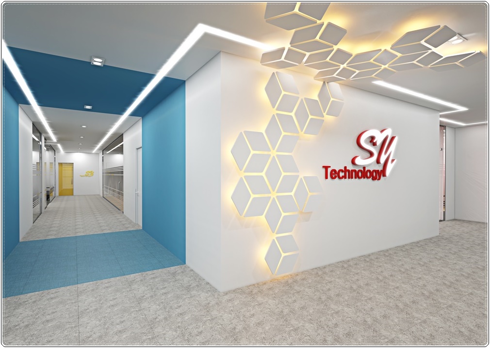라인 조명의 내부 파사드로 연결돼 디자인적 통일성을 주었고 입체적 조형물을 디자인 적용해 임팩트있는 공간을 조성할 수 있게 했으며 벽면에 회사명과 로고를 계획해 가독성을 높였습니다.