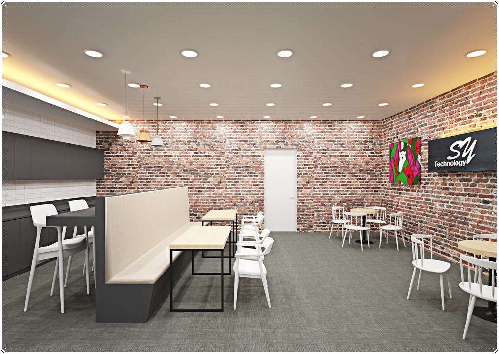 최근 사무실디자인의 트렌드는 기존의 딱딱한 분위기를 탈피하고 젊은 디자인을 더해 개성적인 분위기로 연출되고 있으며 대형 사무실의 휴게 공간은 카페테리아처럼 자유로운 분위기로 연출되고 있습니다. A안은 파벽돌로 벽면을 마감해 빈티지한 분위기를 조성했고 가구는 블랙 앤 화이트 컨셉트로 배치해 모던한 분위기를 조성함으로써 믹스 앤 매치 컨셉트를 연출했습니다.