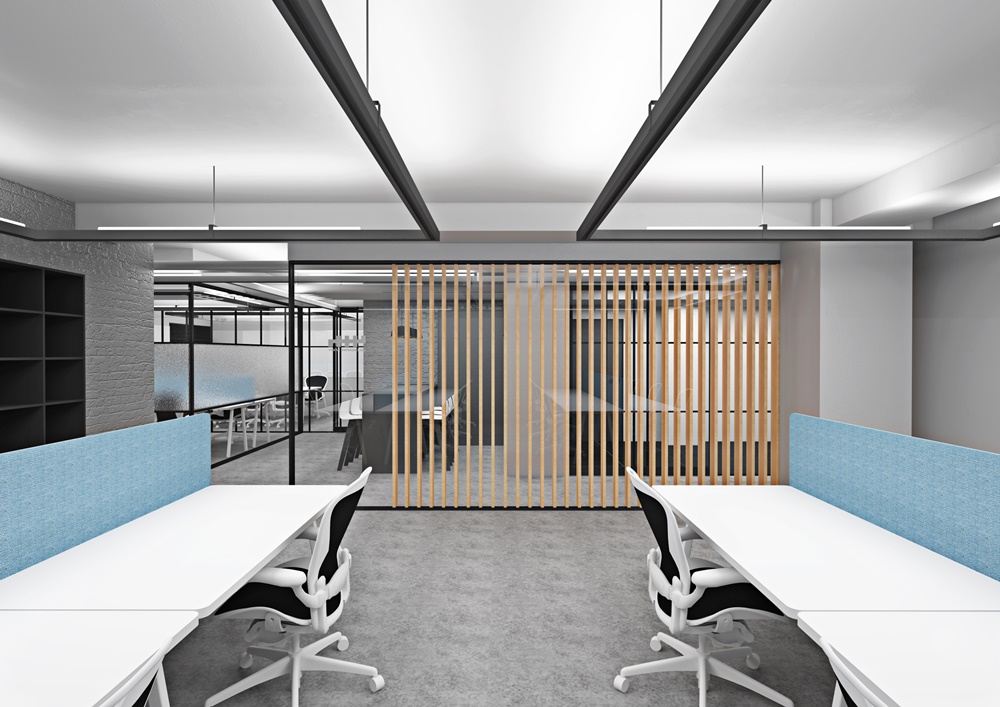 공용 사무 공간 3D 이미지입니다. 업무 효율을 높일 수 있는 공간과 동선을 계획해 유리 가벽으로 레이아웃을 나누면 공간이 답답해 보이지 않고 개방적이면서 독립적인 공간들을 만들어낼 수 있습니다. 그래서 업무 공간이 많이 나눠야 하는 이번 현장에 유리 가벽을 계획하고 프레임 디자인을 변형해 공간마다 적용함으로써 영역성을 부여하고 인테리어 요소로 활용될 수 있도록 계획했습니다.
