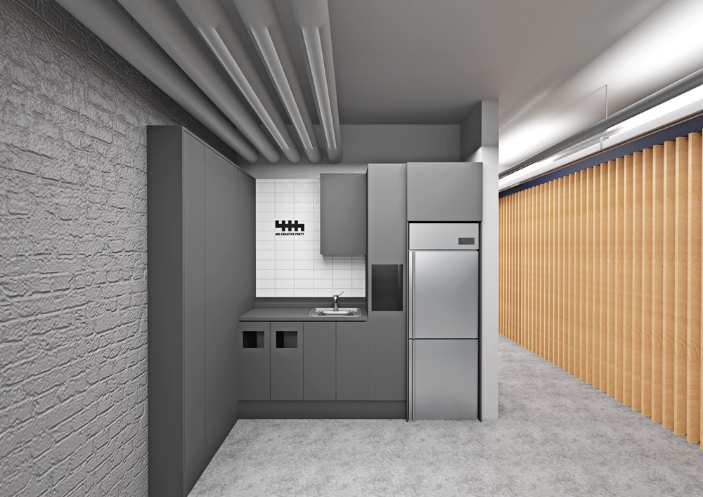 탕비실 공간 3D 이미지입니다. 데드 스페이스가 될 수도 있는 자투리 공간에 상부장과 하부장을 계획하고 간단한 조리를 가능하게 함으로써 차 한잔의 여유를 즐길 수 있도록 했는데요, 이 탕비실의 가장 큰 특징은 배치입니다. 사무실의 중간에 배치되어 사무 공간으로 연결되면서 휴게 공간과도 가까워 효율적인 동선이 만들어짐으로써 직원들이 쉽고 편리하게 이용할 수 있을 것으로 기대됩니다.