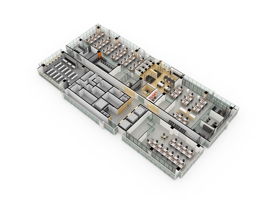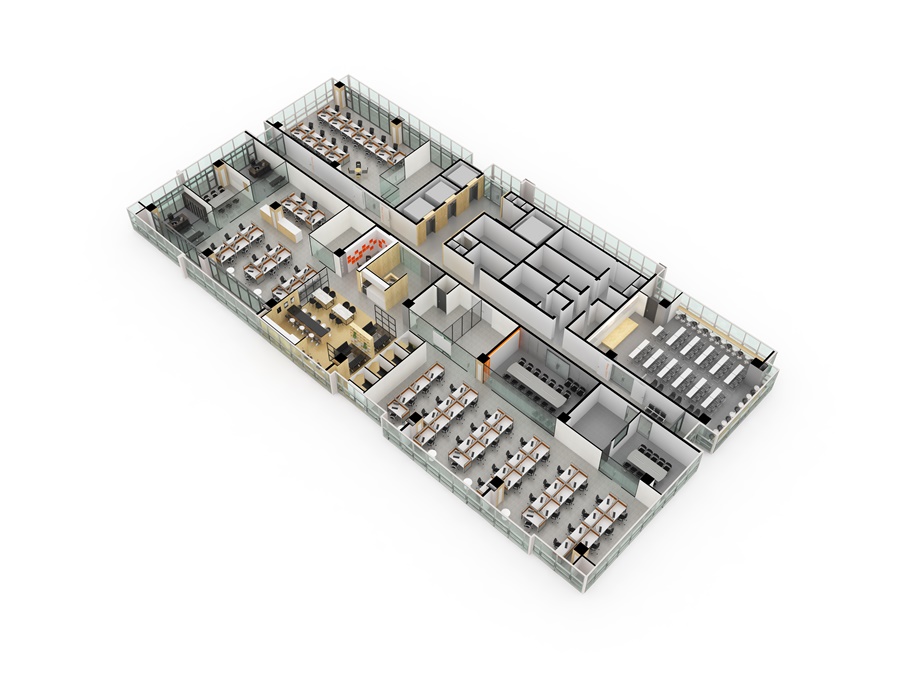이번 평면은 전체를 세 구역으로 나눠 가운데는 휴게공간이 있는 라운지 영역으로 계획했고 양쪽으로 사무공간, 회의공간, 개별공간을 적절하게 배치했으며 직원 동선과 방문객 동선을 명확하게 나눠 보안 유지에 힘쓸 수 있도록 했습니다. 화이트, 블랙의 모노톤에 우드 소재를 포인트로 활용했고 회사명과 로고가 들어가는 부분은 시그니처 컬러를 적용해 회사 정체성과 가독성을 높였습니다.