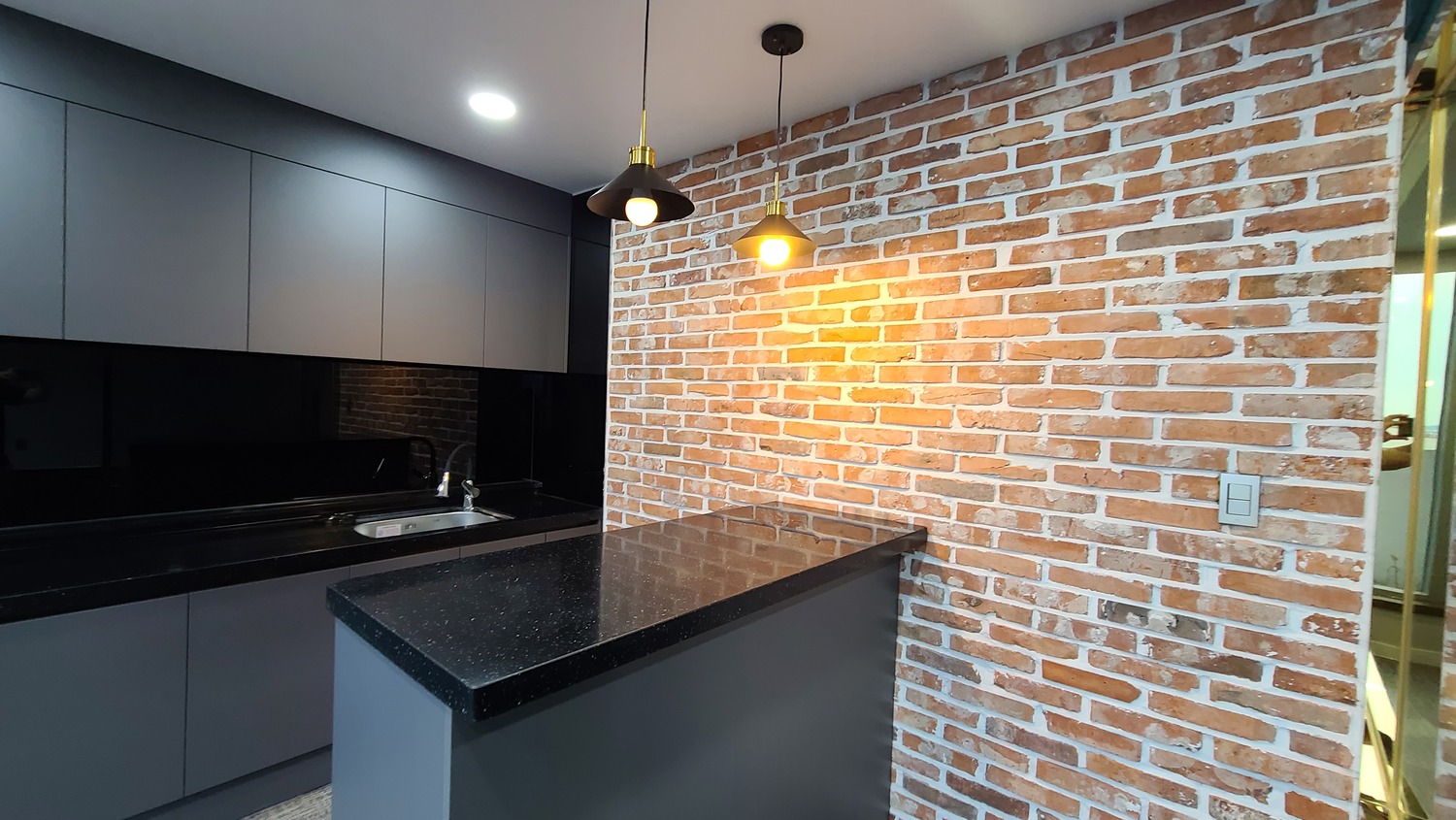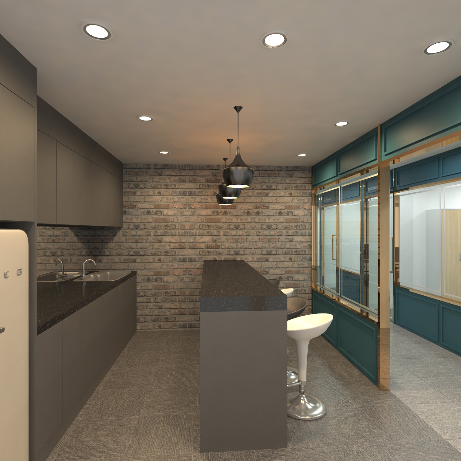 마지막으로 카페테리아 공간입니다. 이 곳은 직원들이 편안하게 휴식을 즐기는 곳이며 그레이 색상의 바닥 재질로 공간의 분리를 시각적으로 표현하였습니다. 그리고 어두운 그레이 색상의 상부장과 하부장으로 이루어진 부엌은 모던하면서도 세련된 미를 자아내고 있는데요. 아일랜드식탁도 함께 시공하여서 간편하게 다과를 섭취하거나 소소한 행복을 누릴 수 있는 휴게 공간이 마련되었으니 워라밸이 공존하는 효율적인 인천 오류동 사무실인테리어라고 생각합니다.