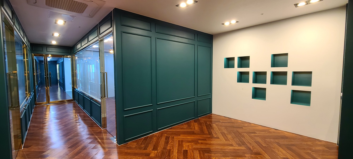 들어서면 인천 사무실인테리어의 대기공간이 보여지는데요. 근무를 하다가 잠깐 휴식을 위할때나 외부에서 손님이 올 때 잠시 편하게 대기하실 수 있는 공간으로 활용되고 있습니다. 바닥은 헤링본으로 아늑한 분위기에 초점을 맞췄고 그린색상과 우드 그리고 화이트의 조화가 마치 자연의 느낌을 내는것이 포인트입니다. 그리고 벽에는 사각형 모양의 틀에 조명을 매립하여서 인테리어적인 요소를 더했습니다.