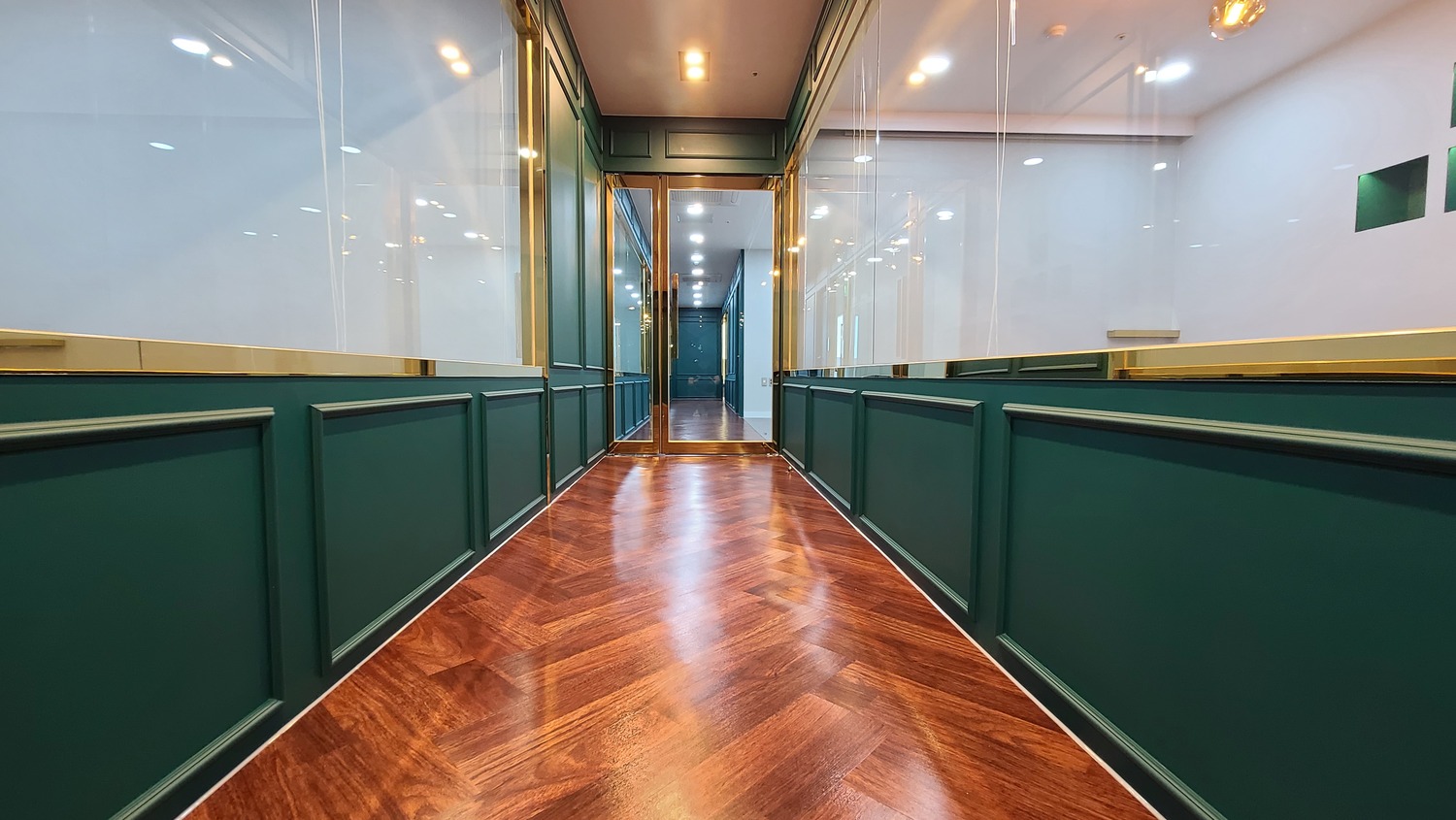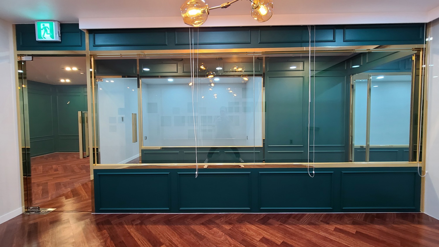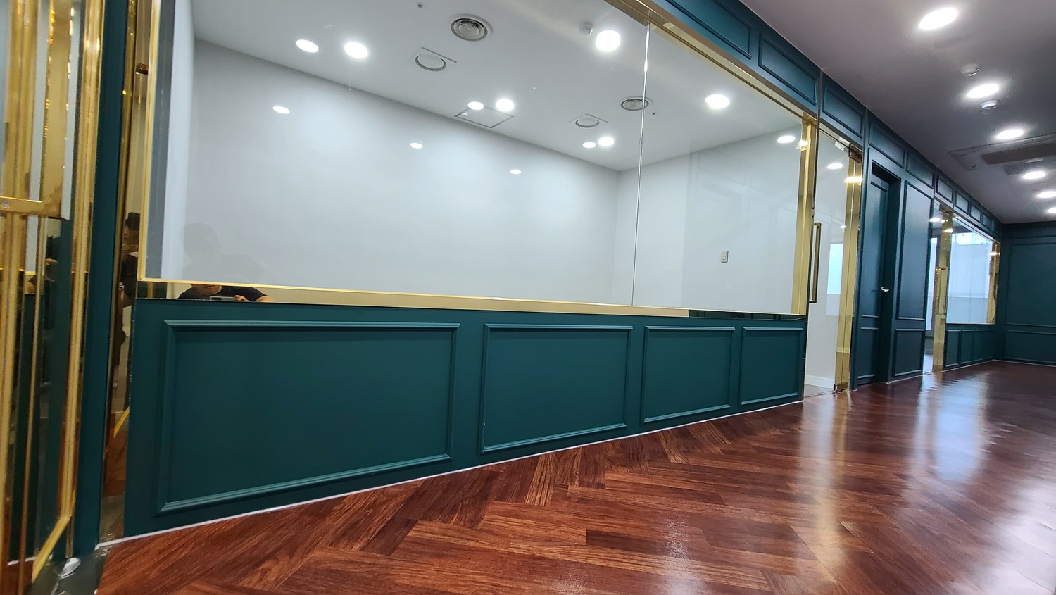 그리고 아무래도 사무공간으로 이어지는 통로가 좁다보니 양쪽에는 통유리로 개방감을 넓혔으며 전체적으로 골드 프레임으로 통일을 이뤘는데요. 혹시나 답답할 수 있는 부분까지 세심하게 고려하여서 전체 디자인을 기획하고 있기 때문에 믿고 맡겨주시면 높은 완성도를 선사해드리고 있습니다.