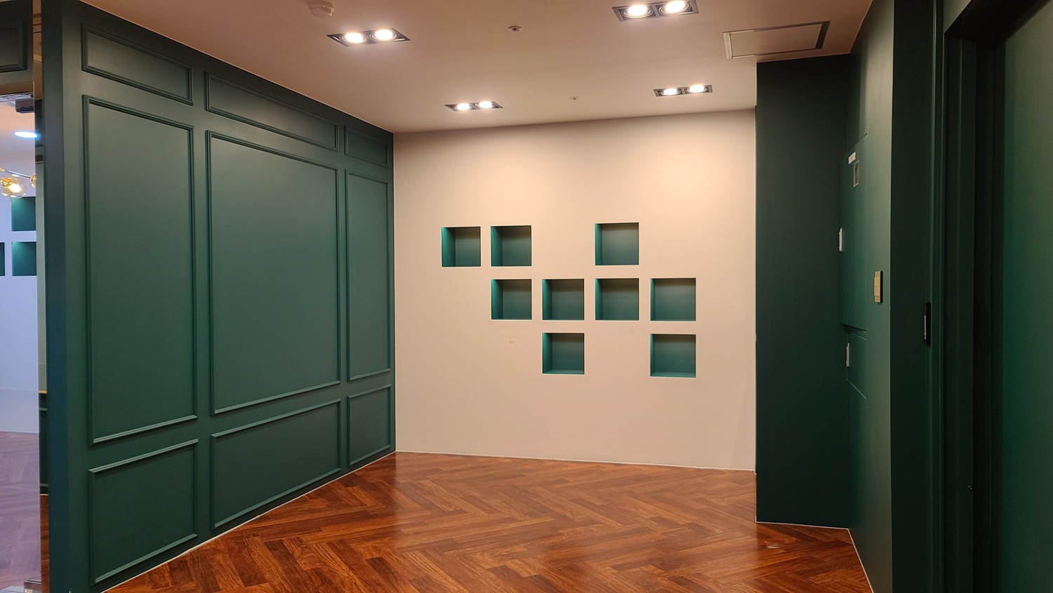 추후에 대기석 및 테이블이 설치 될 공간입니다. 3면이 웨인스코팅으로 이루어진 벽이 감싸고 있으며 위에서 비추는 조명이 더욱 화사하게 공간을 바꿔주고 있습니다.
