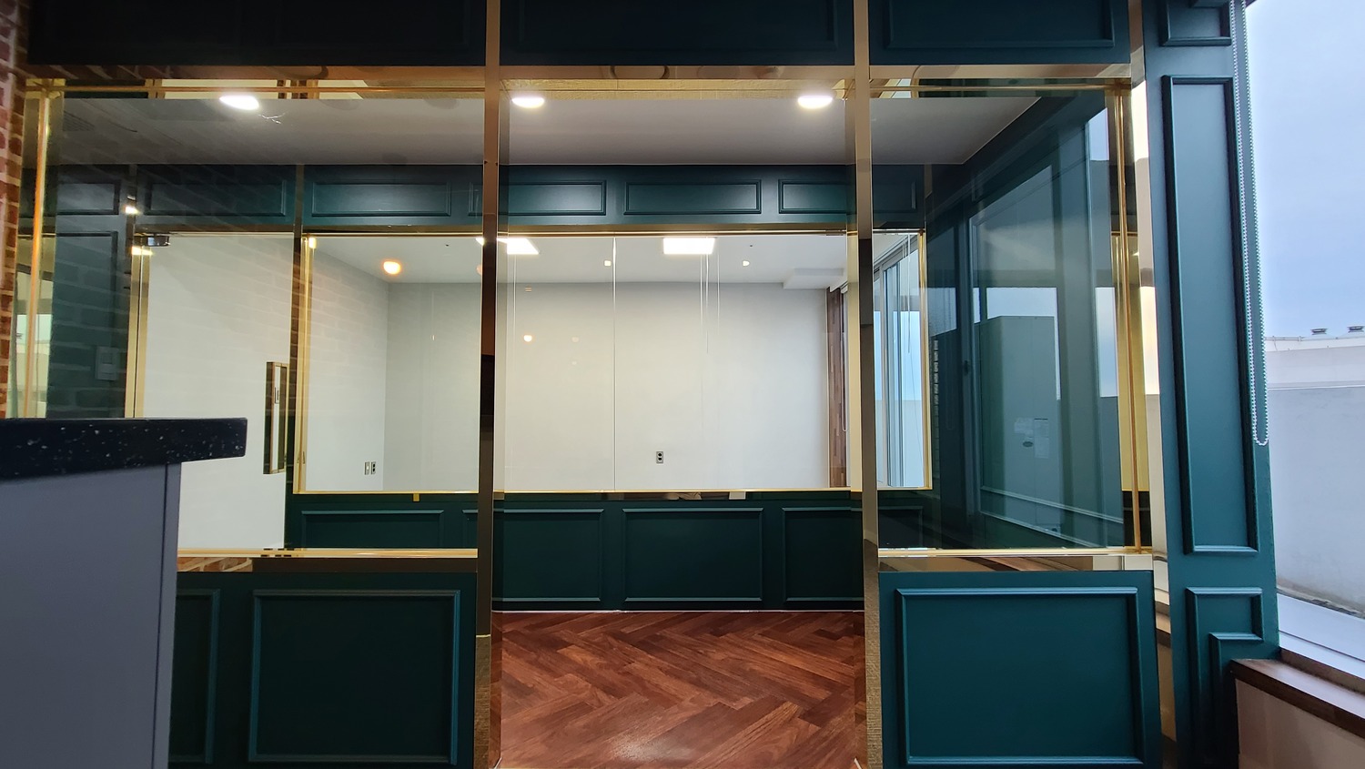 또 전체 유리로 되어 있어 외부 상황이 바로 보임과 동시에 이 건물에는 창문이 끝쪽 밖에 존재하지 않는데요. 전체적으로 공간이 답답하다고 느껴질 수 있기 때문에 모든 공간을 보이는 오픈 형식으로 시공하였습니다. 개방감을 살리기 위해서 효율적인 선택을 하였으며 클라이언트분께서도 창문이 별도로 많지 않아 걱정이 많았는데 더욱 넓어 보이는 느낌이기에 만족하신다고 하셨습니다.
