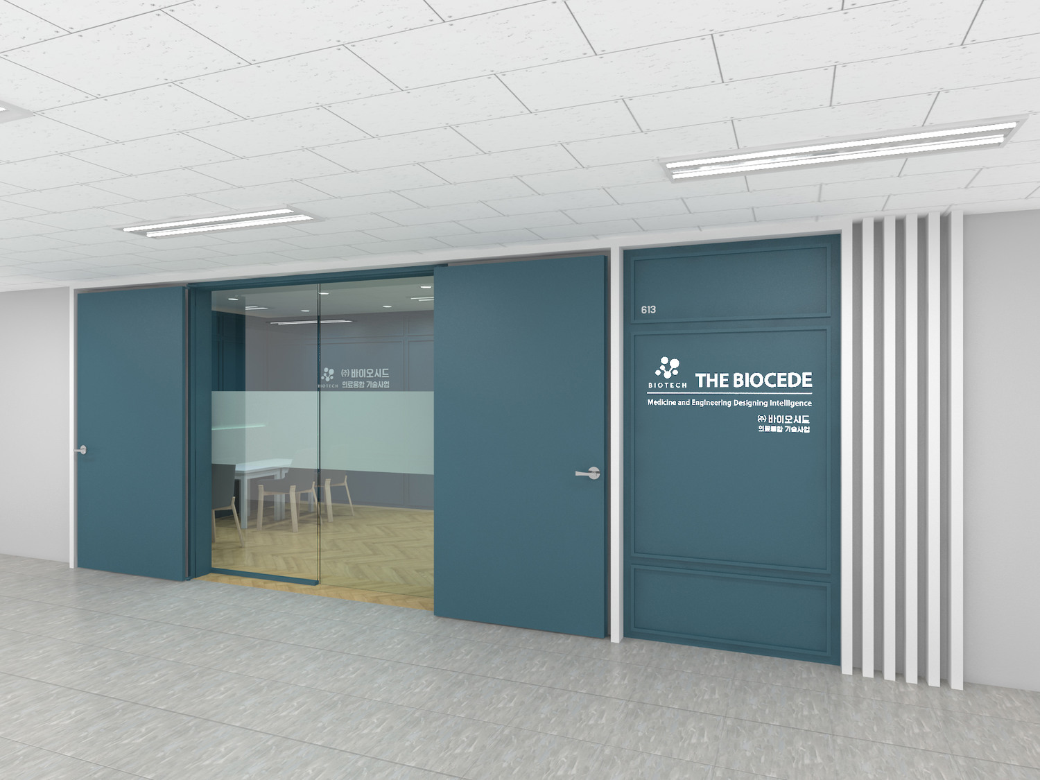바이오시드는 바이오사업에 관련된 기업이기에 깨끗하고 청결한 이미지를 중점적으로 표현하기 위해서 노력했습니다. 우선 전체 컬러 컨셉을 채도 낮은 그린 색상으로 설정하였으며 외부에서 보았을 때도 정돈된 느낌을 주었는데요. 오른쪽에 로고가 새겨져있는 파사드는 웨인스코팅과 같은 기법을 사용하였으며 그 옆에도 템바보드 형식의 기둥으로 다채로움을 더하면서 입구의 웅장함을 보여주었습니다.