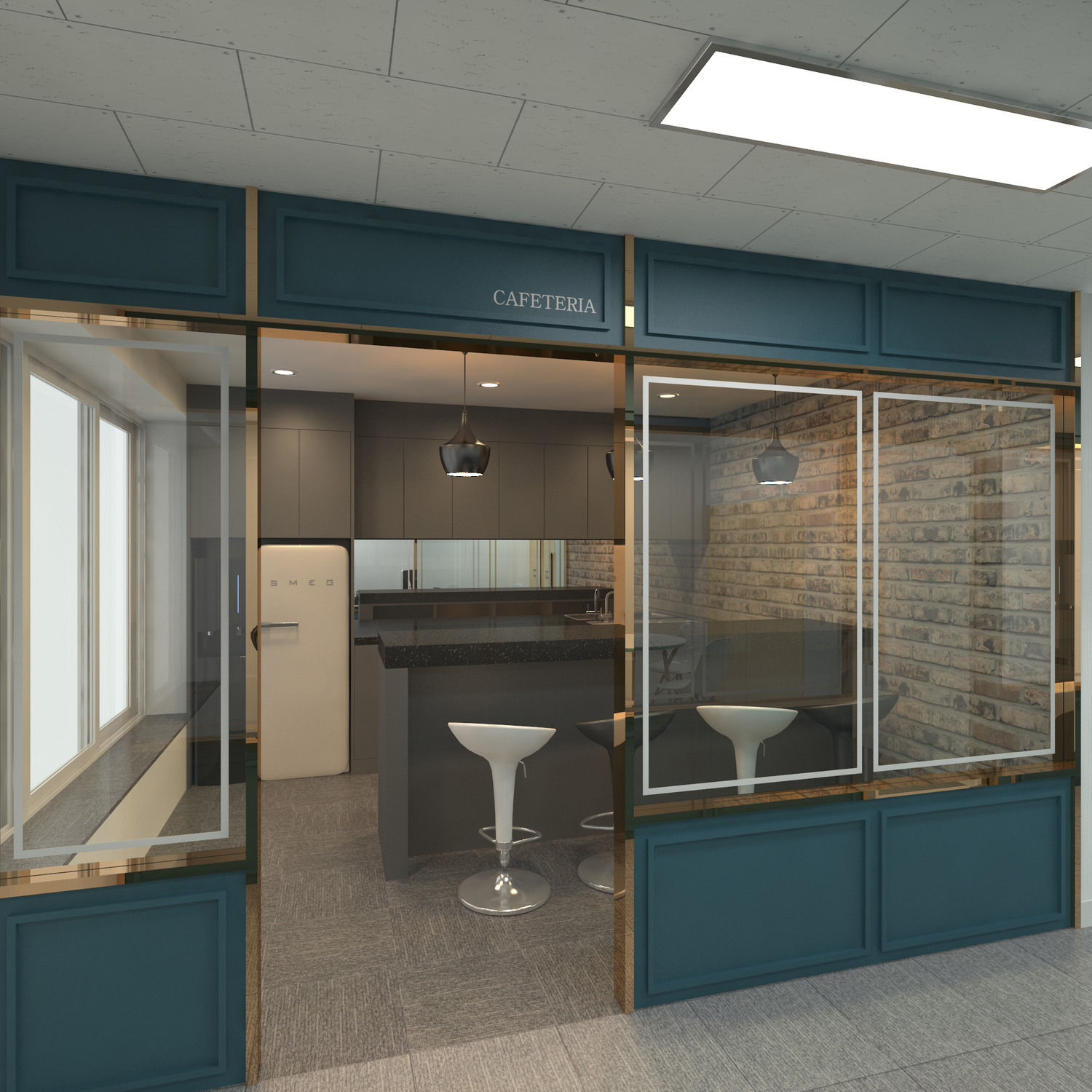 카페테리아는 직원들이 일을 하면서 곧바로 커피 한 잔의 여유를 즐기거나 간단한 식사를 할 때 이용해볼 수 있는데요. 요즘에는 사무실 인테리어를 진행하면서 사무 공간만 만들어두는 것이 아닌 업무의 효율성을 높이고 직원의 복지와 만족도를 위해서 이렇게 휴게 공간을 별도로 연출하는 의뢰가 많아지고 있는데요. 점점 워라밸을 중요시하는 모습이 반영되는 것이라고 생각합니다. 휴게 공간은 깔끔하고 관리 및 유지하기 쉽기 위하여 어두운 컬러로 구성하였으며 상부장과 하부장에 수납 공간도 마련하였습니다.