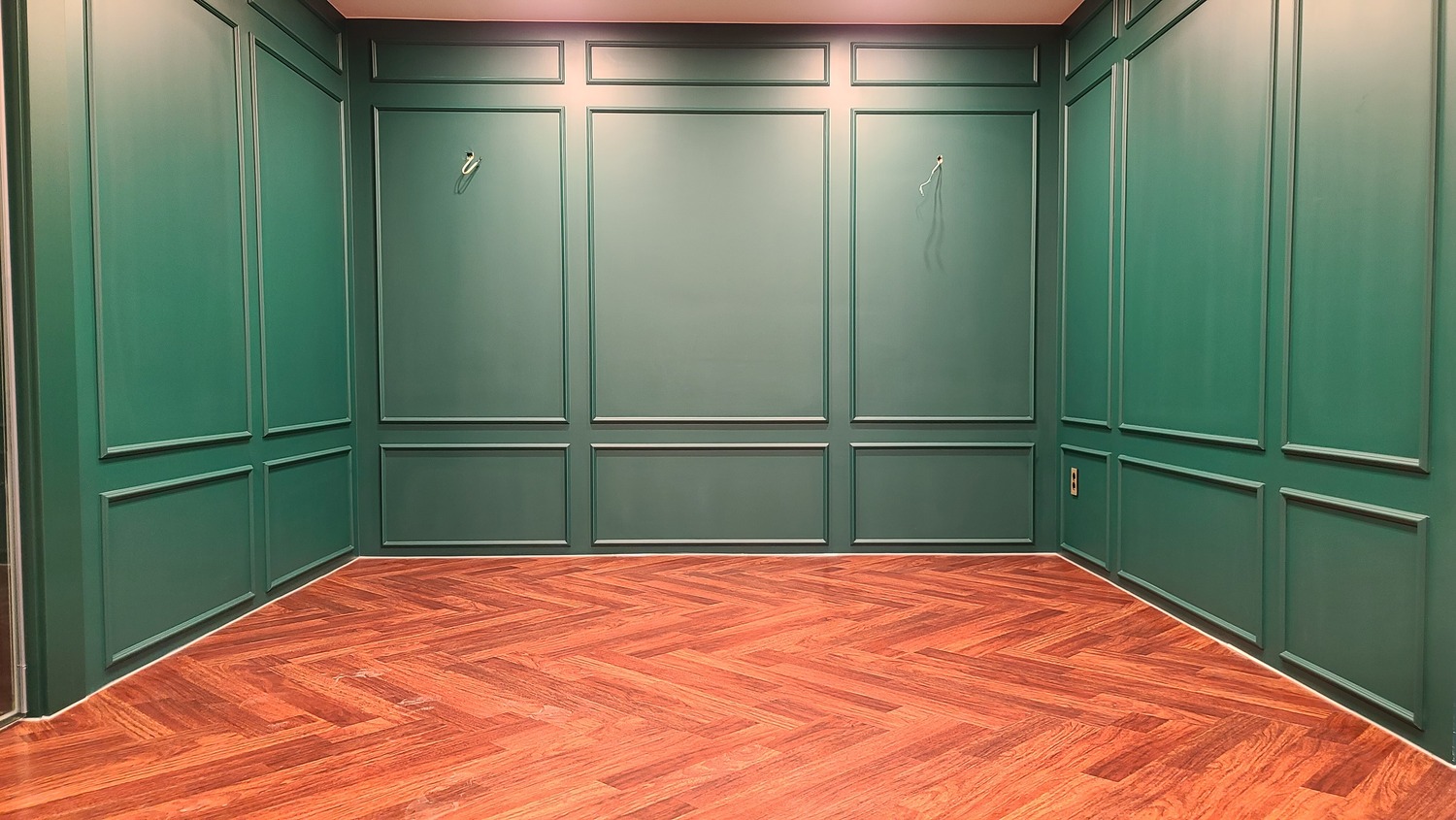 동선을 따라서 조명이 설치되어 있으며 하단과 상단에도 웨인스코팅이 양각으로 처리되어있는데요. 밋밋한 도장으로 마감하면 깔끔해보이기는 하지만 오히려 공간의 매력도가 떨어지기도 합니다. 그래서 최대한 클래식한 멋을 살리기 위해 헤링본 우드와 어울리는 웨인스코팅으로 연출을 시도해보았습니다.