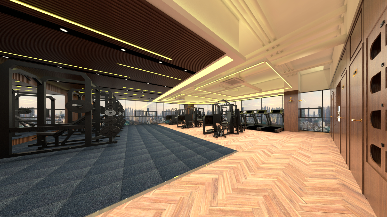회원님들이 운동을 하시는 공간을 살펴보겠습니다. 천장에는 전체 템바보드 형식으로 마무리를 하면서 곳곳에 라인 조명을 삽입하였습니다. 클라이언트분께서도 가장 마음에 들어하셨던 조명 인테리어로, 밋밋하지 않으면서도 간접적으로 시야를 밝혀줄 수 있었는데요. 이렇게 조명 하나의 차이가 공간의 매력을 좌우할 수 있습니다.