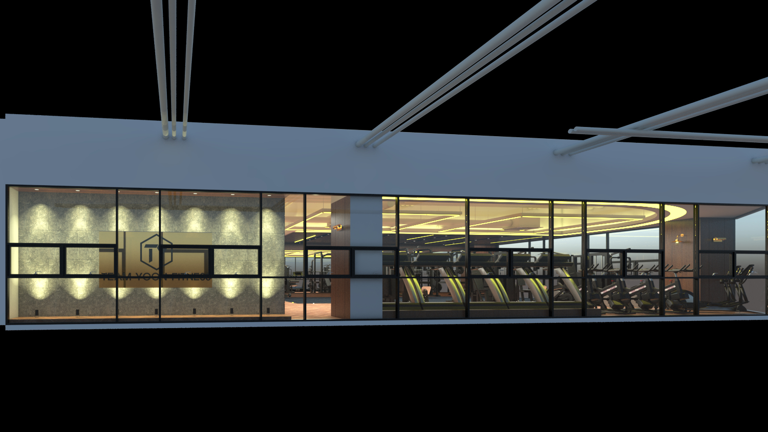 인천 청라 상가인테리어 헬스장 피티샵 현장의 유산소 운동 공간은 통창을 바라보면서 배치를 해두었습니다. 보통의 헬스장에서도 오랜 시간을 머무르는 유산소기구의 경우 창문을 향해 있는것을 볼 수 있는데, 이는 지루함을 감소하기 위한 사람의 심리적인 요소가 들어있는 아이디어입니다.