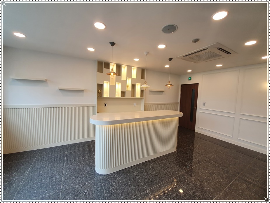 전체적으로 화이트와 연한 그레이를 적용해 깔끔하면서 세련된 분위기로 조성했고 원형 매립등, 간접 조명, 벽부조명 등을 적용해 더욱 화사하게 해 쾌적한 공간이 되도록 했습니다. 바닥에는 테라조 타일을 적용해 클래식하면서 특색있는 분위기를 연출했고 더불어 디자인적 균형을 이루도록 했습니다. 휴게 공간은벽면에 벤치형 의자를 계획해 편안하고 안락하게 사용할 수 있도록 했고 팬던트형 조명을 적용해 은은한 분위기를 연출하도록 했습니다.